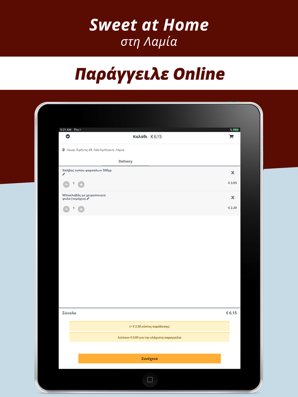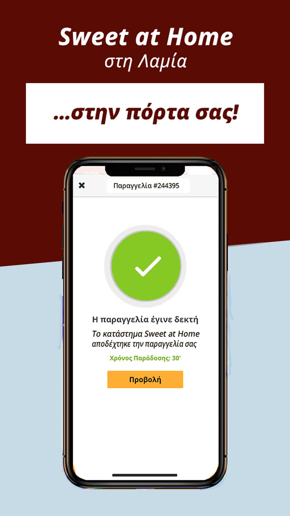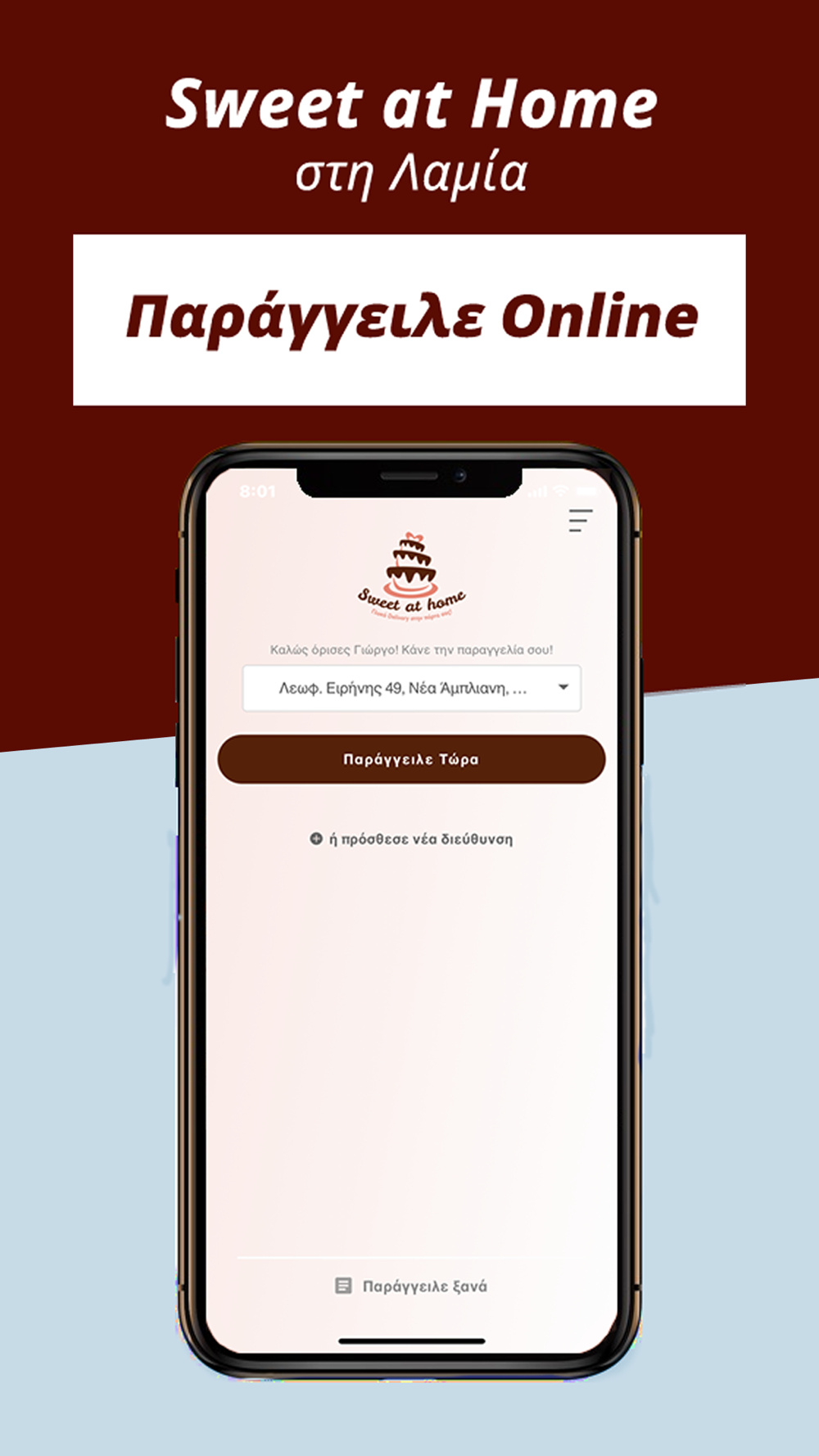 Κατέβασε την εφαρμογή, δες τα συνεργαζόμενα ζαχαροπλαστεία και παράγγειλε το γλυκό της αρεσκείας σου. Στο φέρνουμε εντός λίγων λεπτών... στη πόρτα σου!