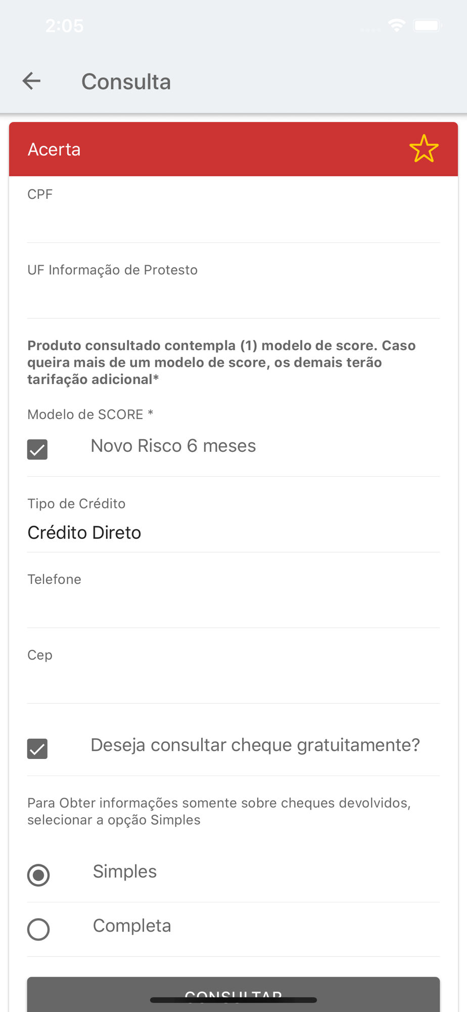 O aplicativo possui opções para Pessoa Física, Pessoa Jurídica, Cheque e Veículos. Possui um help com informações sobre cada tipo de consulta e também consulta à situação cadastral na base de dados da receita federal para CPF e CNPJ. Ao final de cada consulta é emitido um número de resposta, que poderá ser consultado posteriormente através do Sistema de gerenciamento da Entidade.