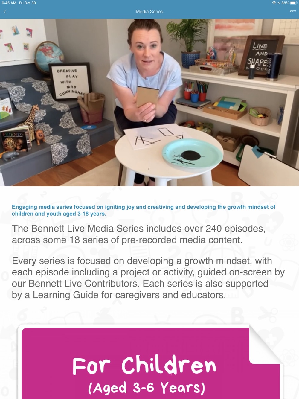 Engaging media and educational programming for children and youth, ages 3-18. Bennett Live offers a media series, live and self-paced classes, and home learning pods. Learners go on explorations, create projects, connect with friends, and develop their creative and problem-solving capabilities.