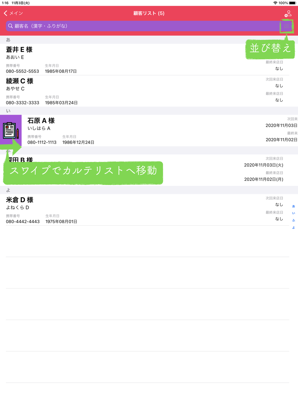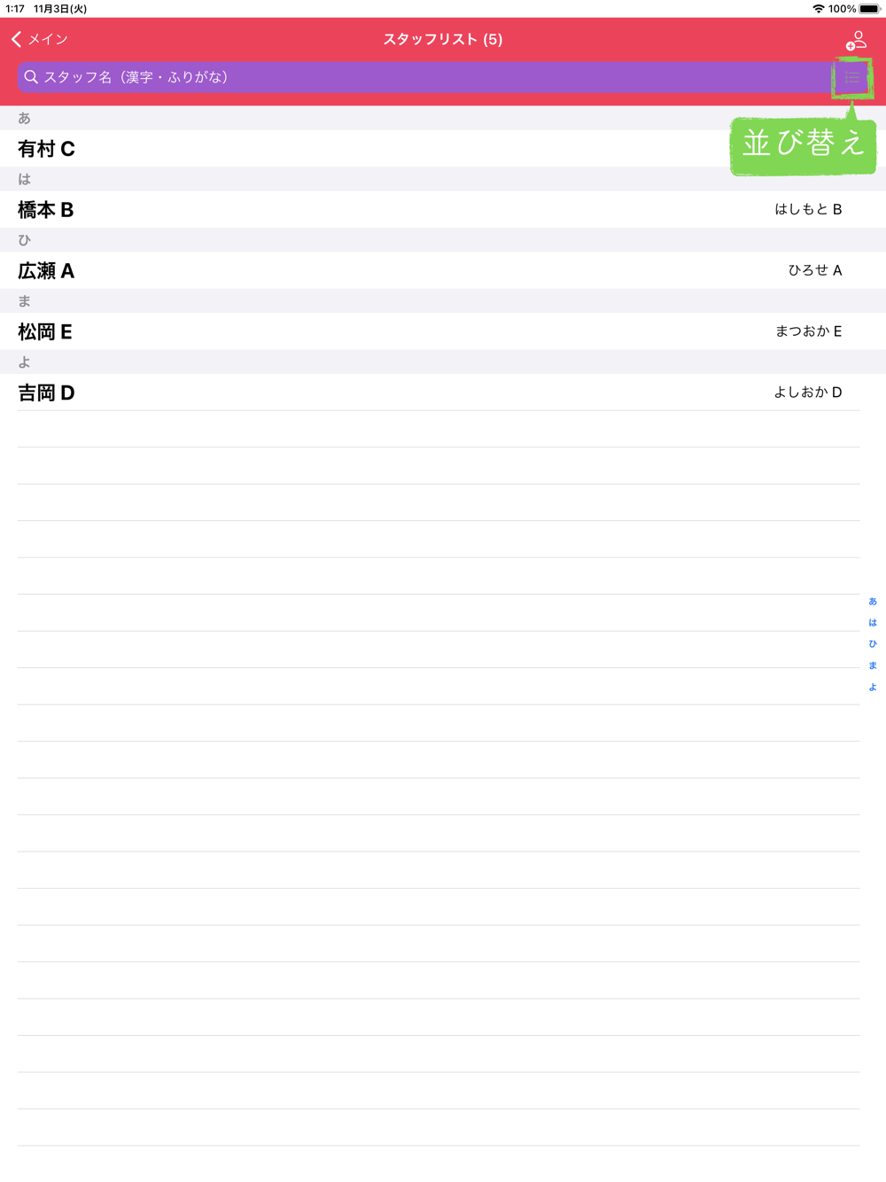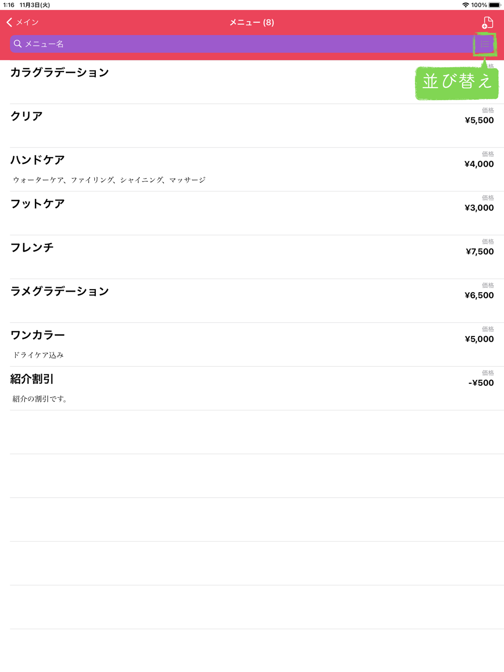 ・顧客、メニュー、スタップリスト:データが3件以上登録されている場合、検索バーを表示