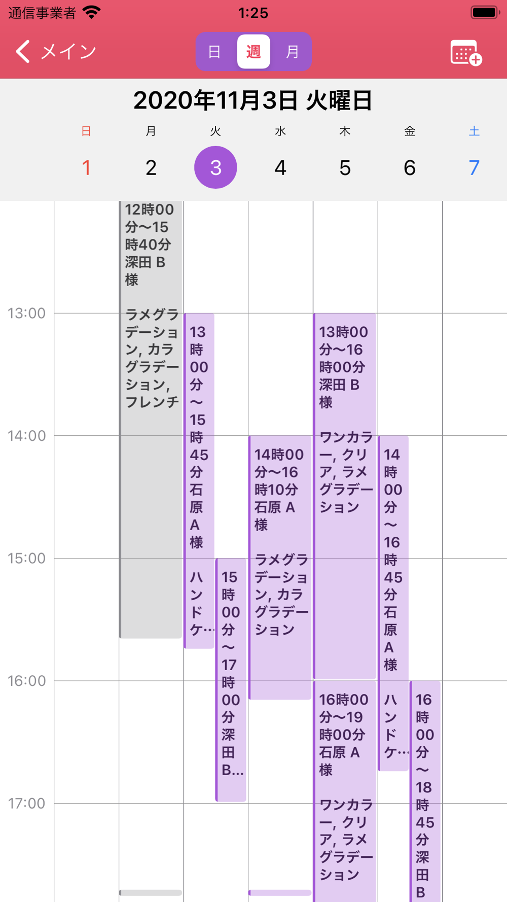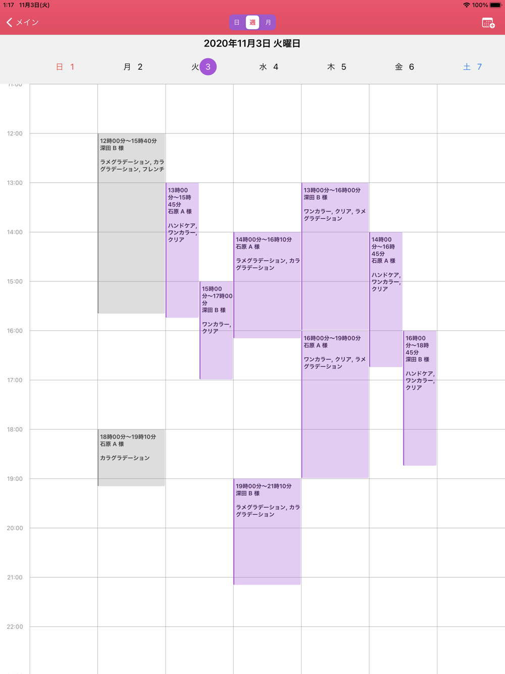 →カレンダー(日、週、月)でカルテ(予約)追加、編集