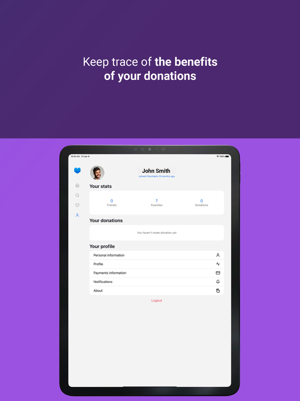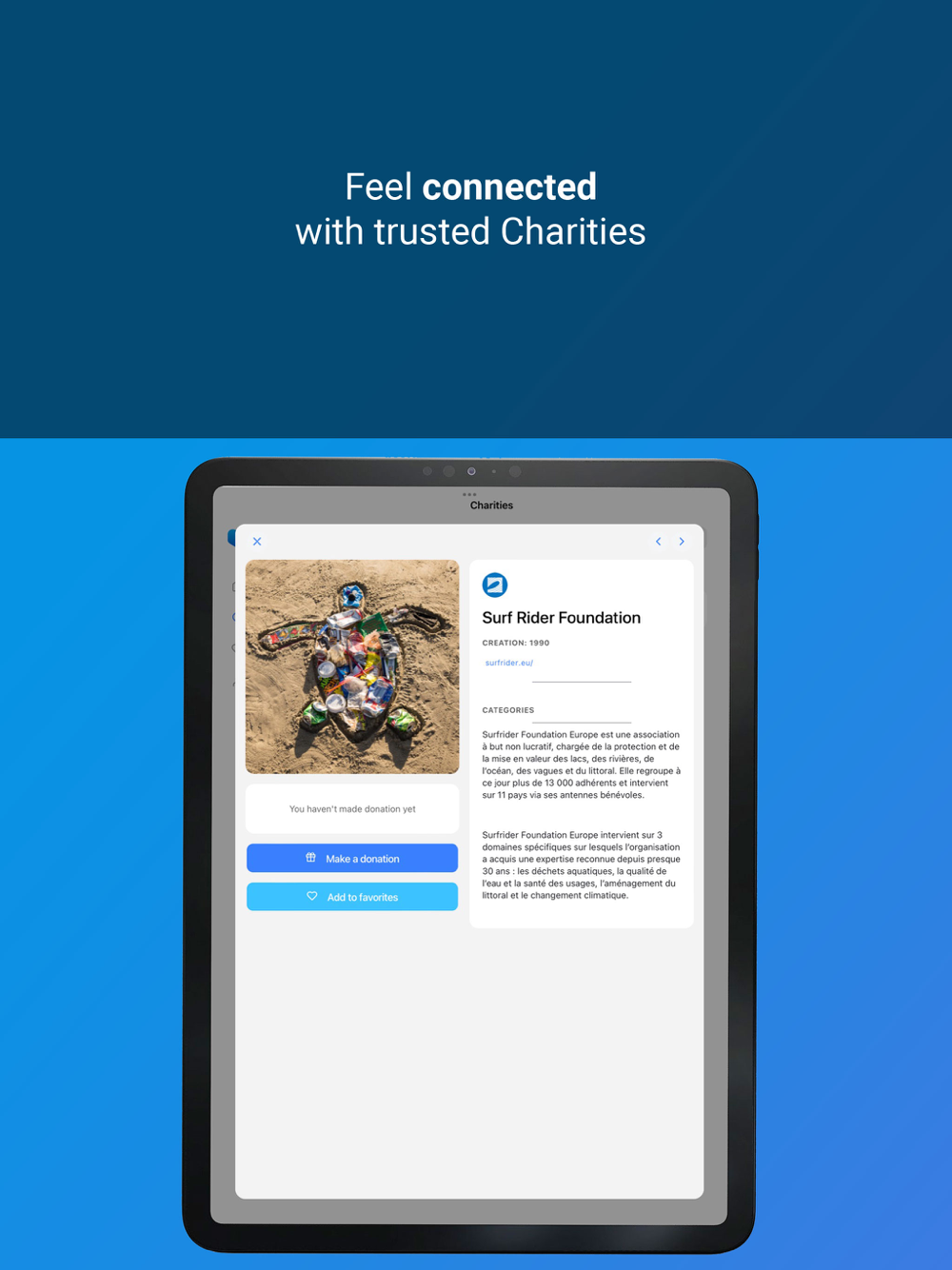 Make donations to your favorite charities, keep trace of what you have given, measure your impact and share it with the world. Charitable helps charities collecting funds and provide them a unique way to communicate with their donators. On the other side, it helps donators to give really easily and provide them a complete history of their givings. Be generous, it feels good, and it helps others!
