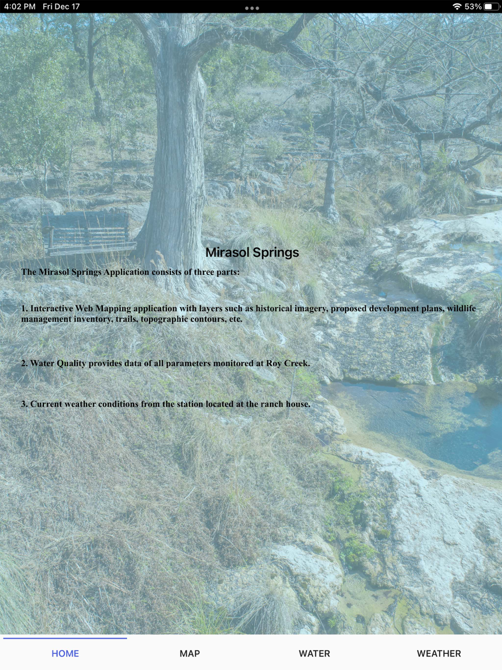 All new layout. Simplified version with one password protected map, water quality monitoring data tab for Roy Creek, and current weather conditions.