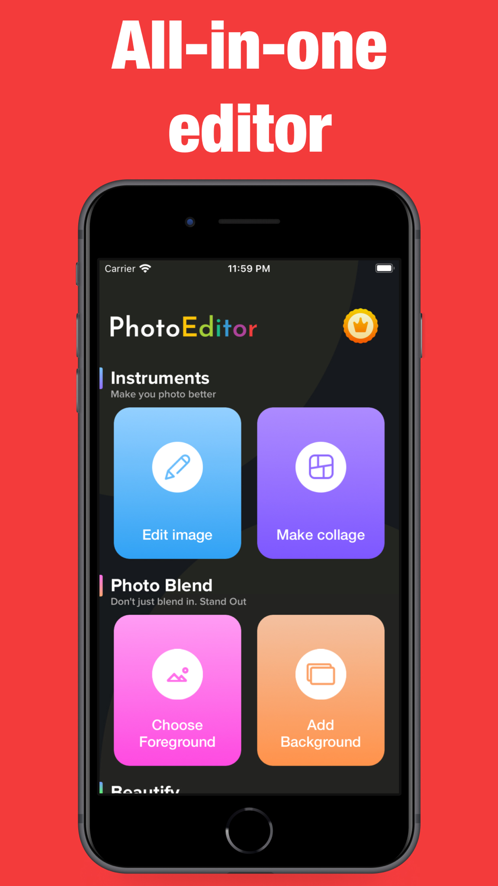 Want to improve your photos? Photo editor will allow you to edit any pictures - add effects, edit the background, combine your favorite photos into a collage: the result, a unique photo with a striking design, which highlights every detail. Don't have any editing experience? This is not a problem with our application because a set of simple tools, filters, and effects: will make your picture look professional even in the hands of a beginner.