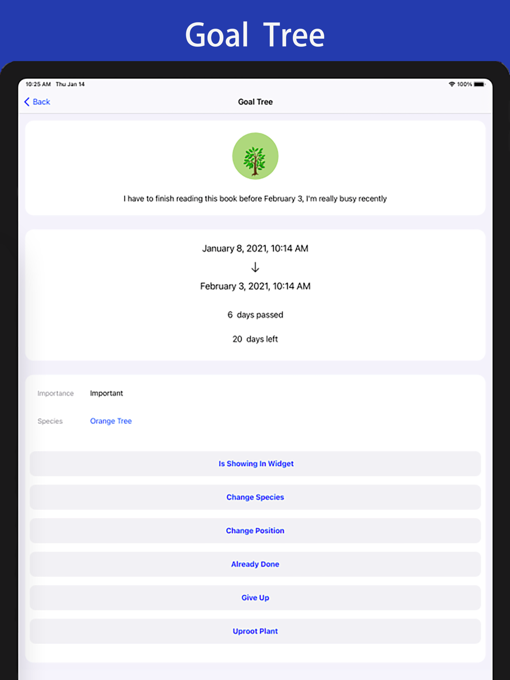 The Widget of PTree can help you solve this problem. PTree provides the smallest size widget and displays all goal trees randomly, which means you can be reminded Occasionally