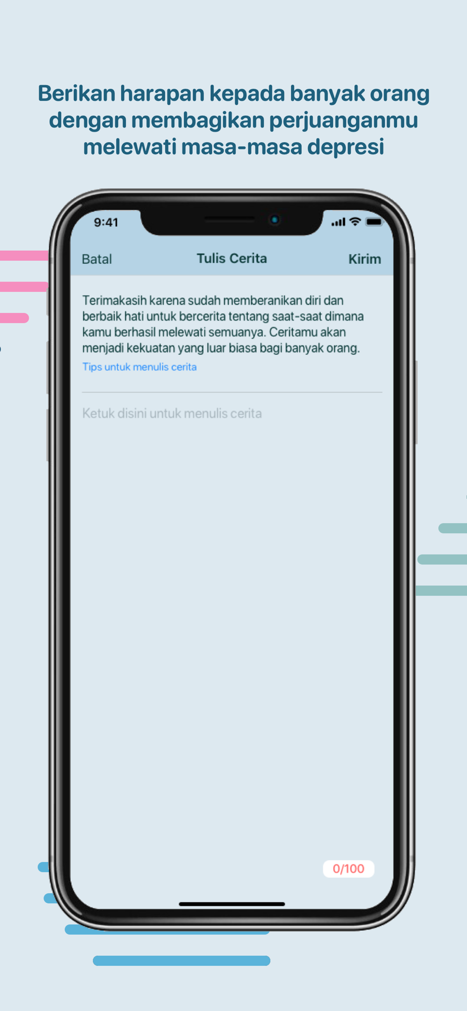 YANA mendorongmu untuk menyuarakan isi hati dengan mengirimkan kisah perjuanganmu melewati dan mengatasi hari-hari buruk, untuk menunjukkan kepada orang-orang yang mungkin saja memiliki permasalahan yang sama bahwa selalu ada harapan sehingga dapat membantu mereka melewatinya. Kamu juga dapat saling mendukung dan menunjukkan kepada orang-orang jika mereka tidak sendirian.