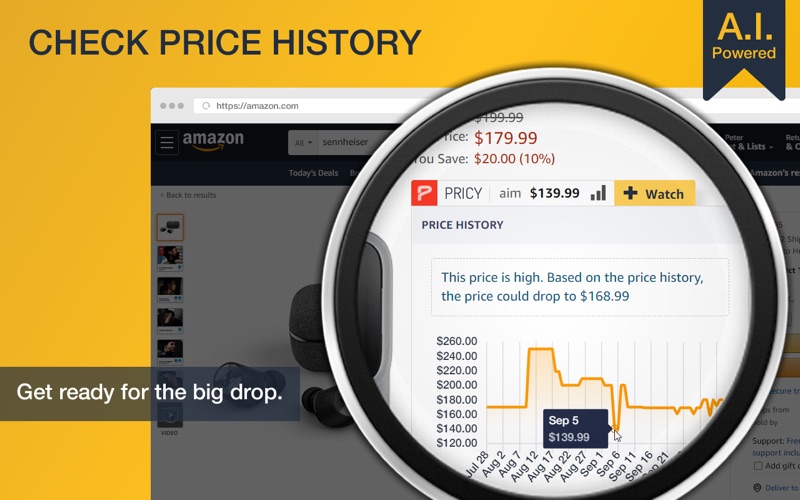 Just hover over, and Pricy will show you how the price changed in the past so you can easily find trends and get ready for the big drop.