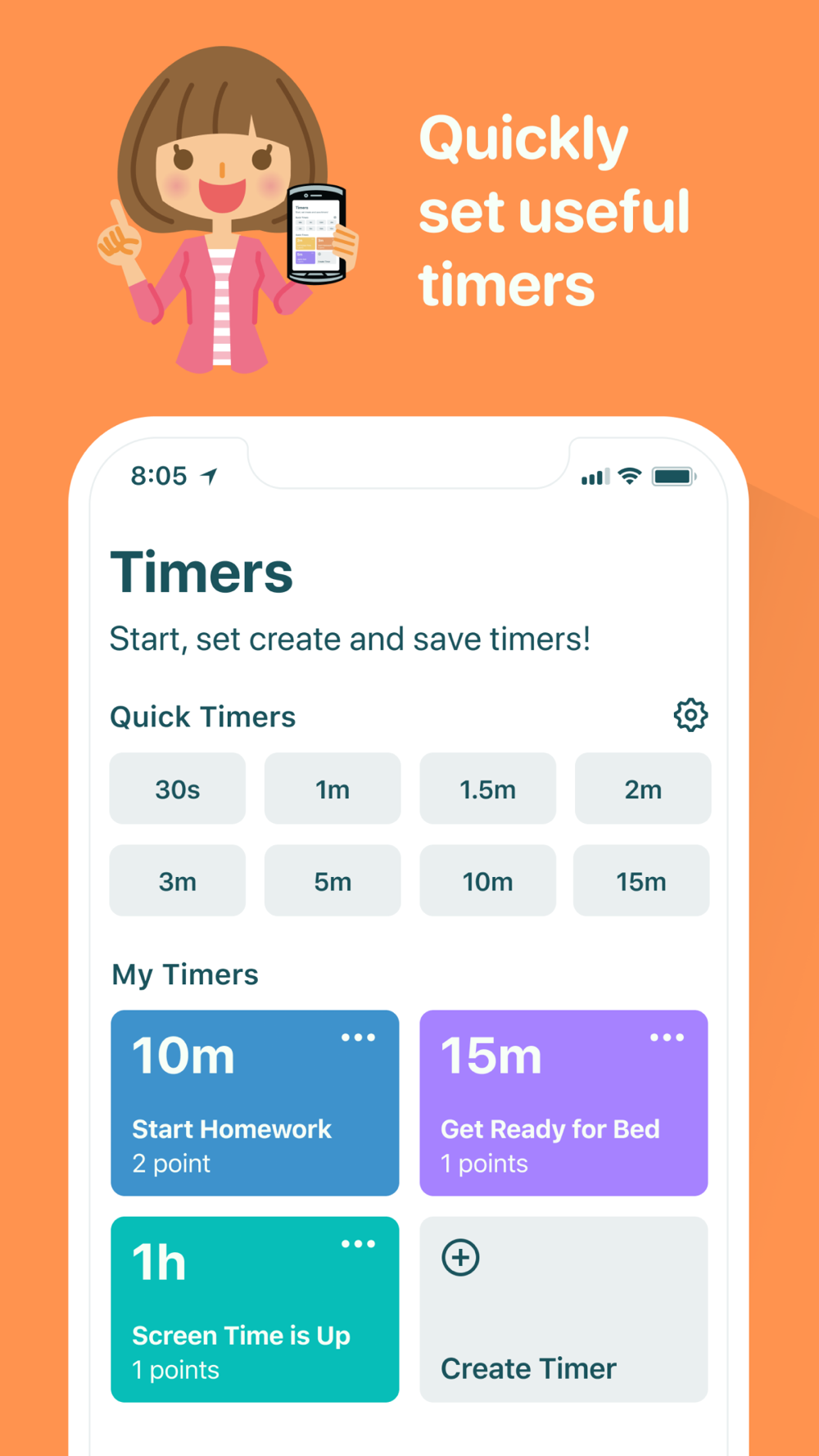 Time challenges are irresistible to most kids. Goody Points allows you to quickly set timers to signal and motivate your kids towards action. You can also create the perfect set of custom timers for your daily routine.