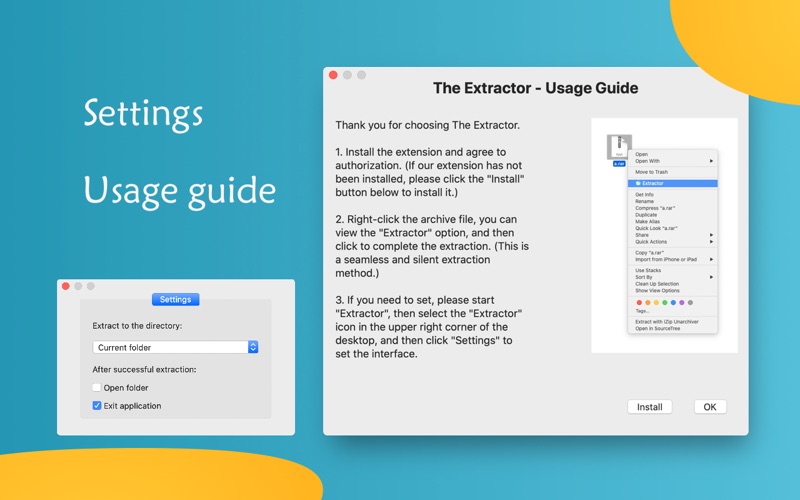 "The Extractor" is simple to operate, friendly interface, ready-to-use, clean and safe, it is an essential decompression tool on our Mac computers.