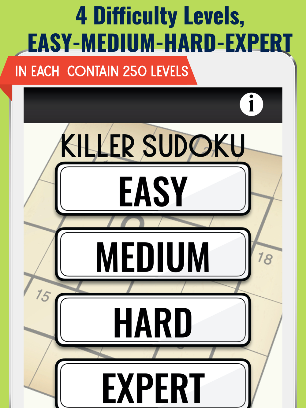 * 4 Difficulty Levels, EASY-MEDIUM-HARD-EXPERT each difficulty level contain 250 level.