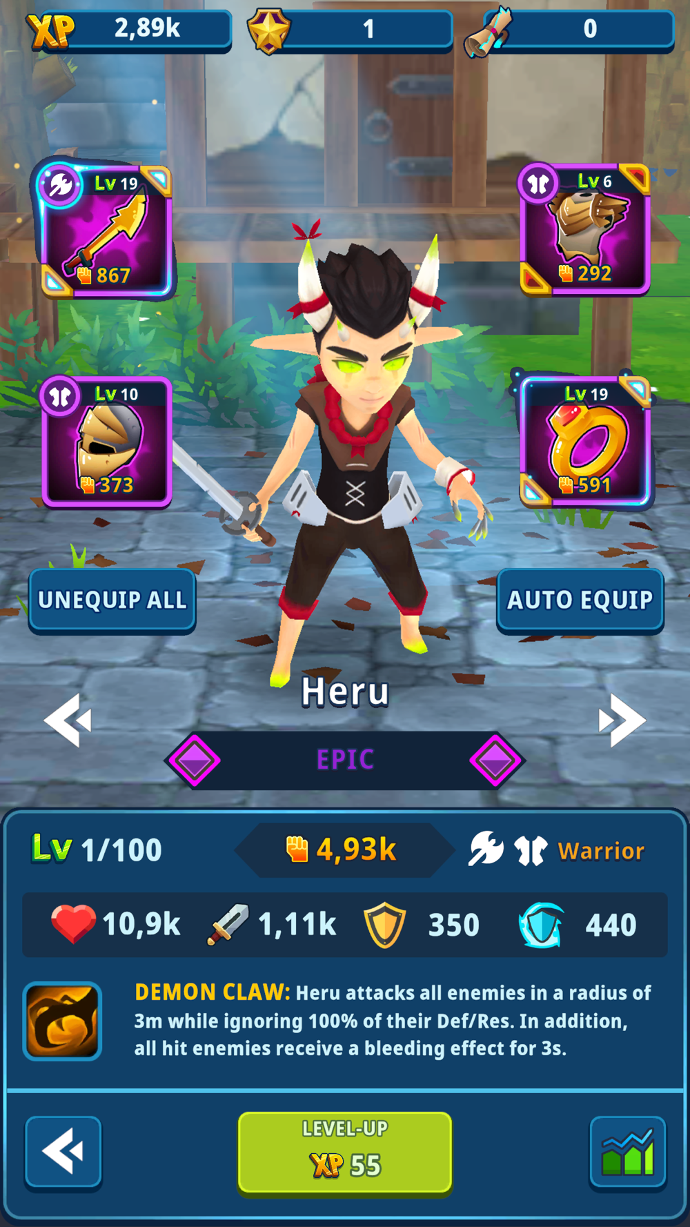 Invest your money and idle income to upgrade your dungeons. Decide wisely in which hero to invest your experience points and rare valor to become stronger. Fuse duplicate hero cards to make them even more powerful.