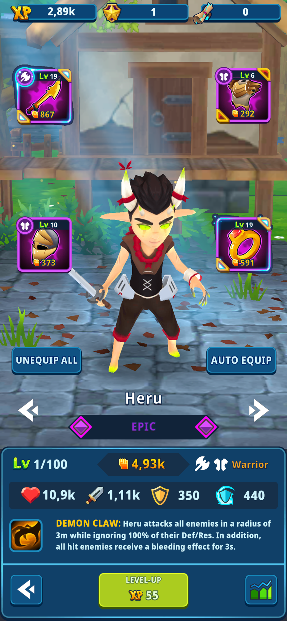 Monsters continuously attack the nearby villages. Besides exploring new dungeons you also have to protect them. Test your skills in the village siege mode and earn experience points needed to level up your heroes.