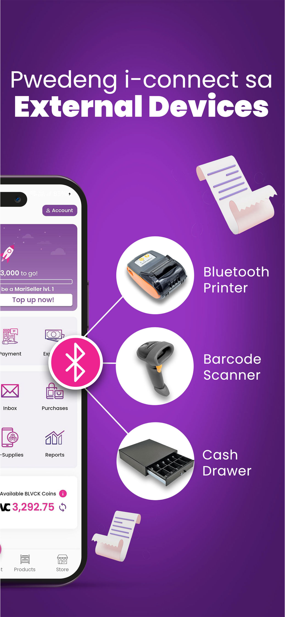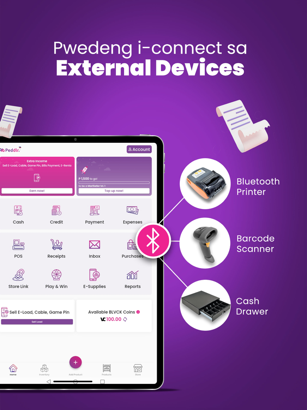Simplify inventory management by connecting Peddlr to your barcode scanner, printer, cashier drawer and more. Connect external POS devices via bluetooth for faster and smooth cashier system process.