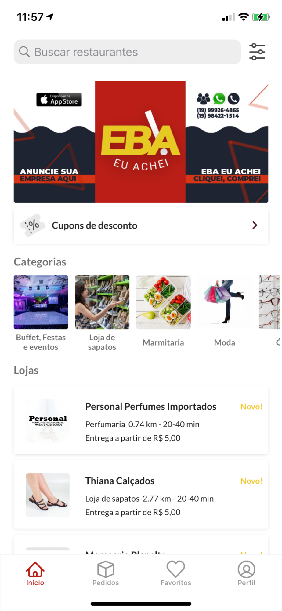 Baixe o app EBA EU ACHEI, peça sua comida e faça suas compras. Aqui você tem listas com diversas opções com entrega grátis, retirada e muito mais. Com nosso delivery, você pede pratos dos melhores restaurantes ou aproveita para fazer suas compras online e receber tudo em sua casa ou trabalho.
