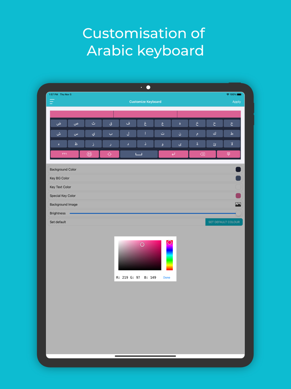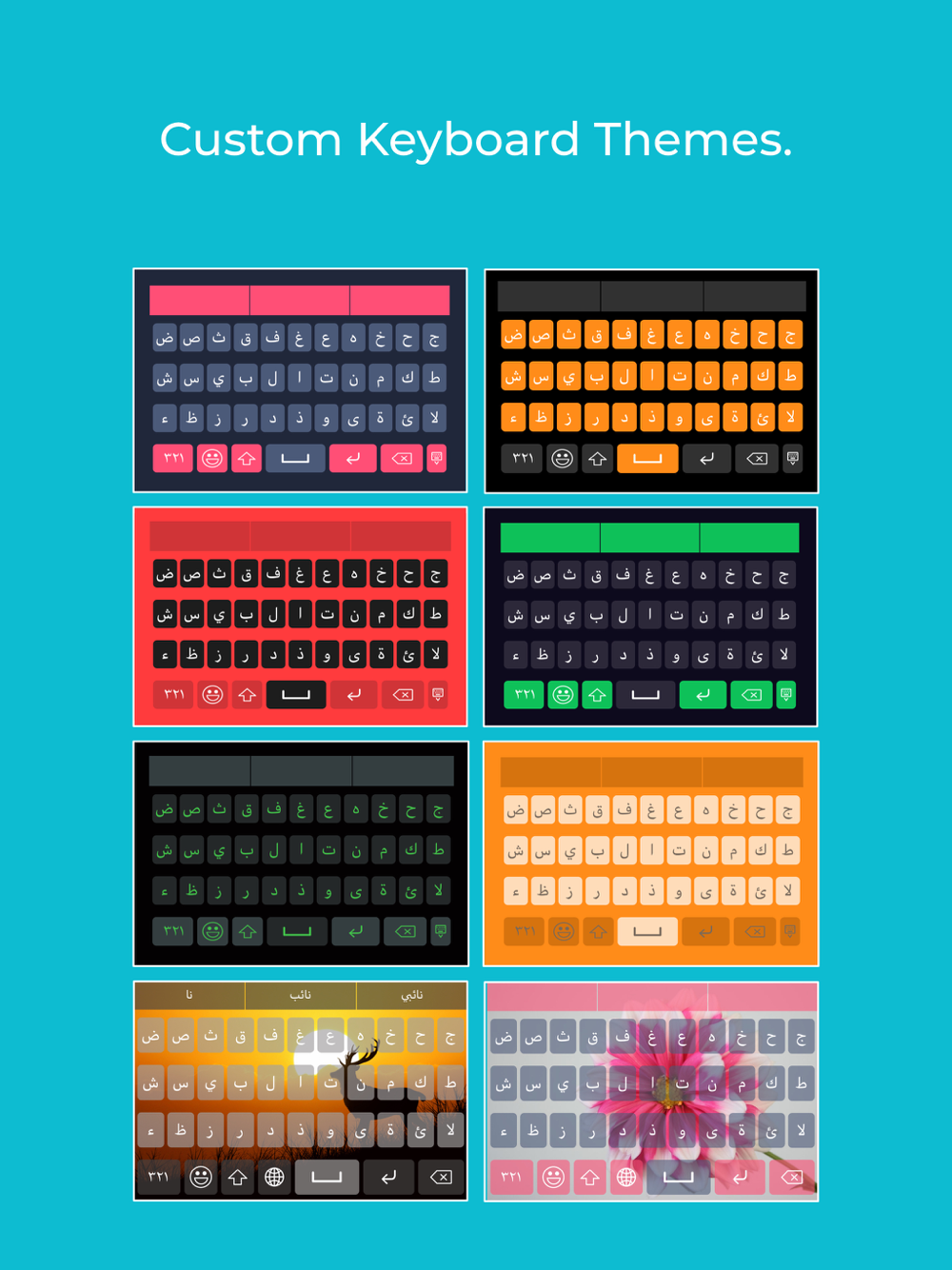 • Change colors for the Background colour, Key background colour, Keyboard text colour, Suggestion box colour etc, so that typing does not seem boring and monotonous with this Arabic keyboard for iOS.