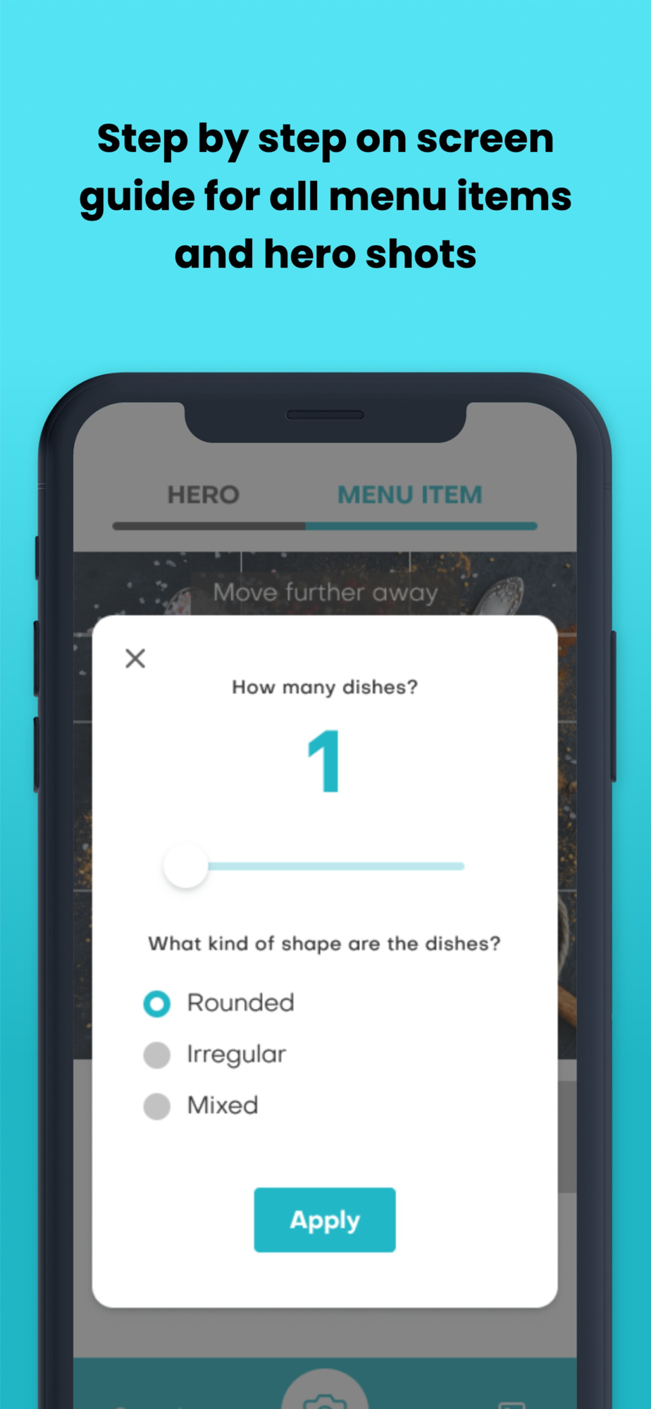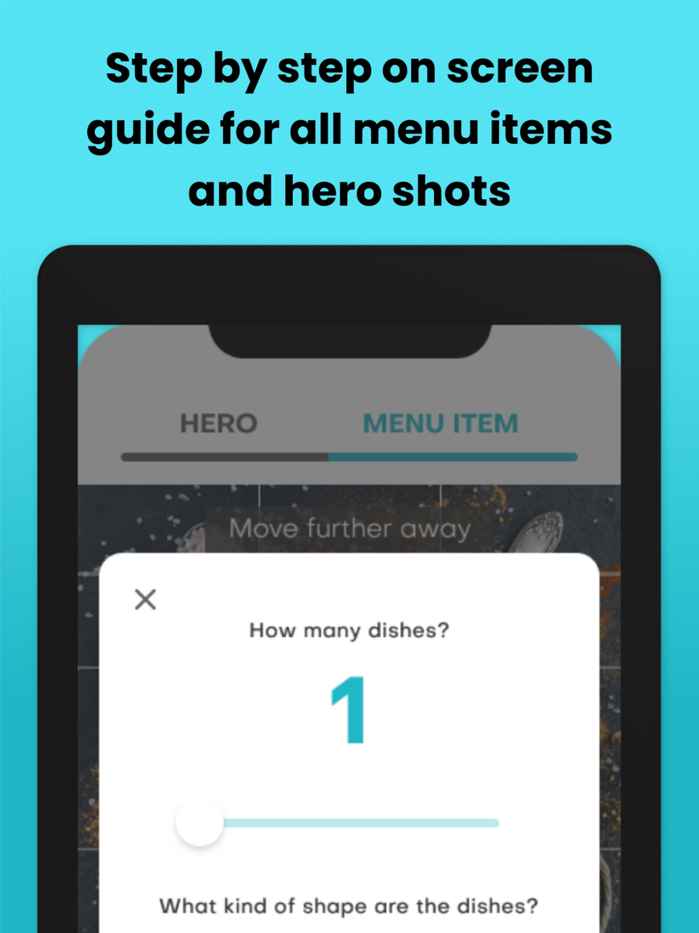 Step by step, the App is your on-screen assistant, giving you directions for distance, lighting, focus, layout and more. It even takes into account the size and shape of your tableware.