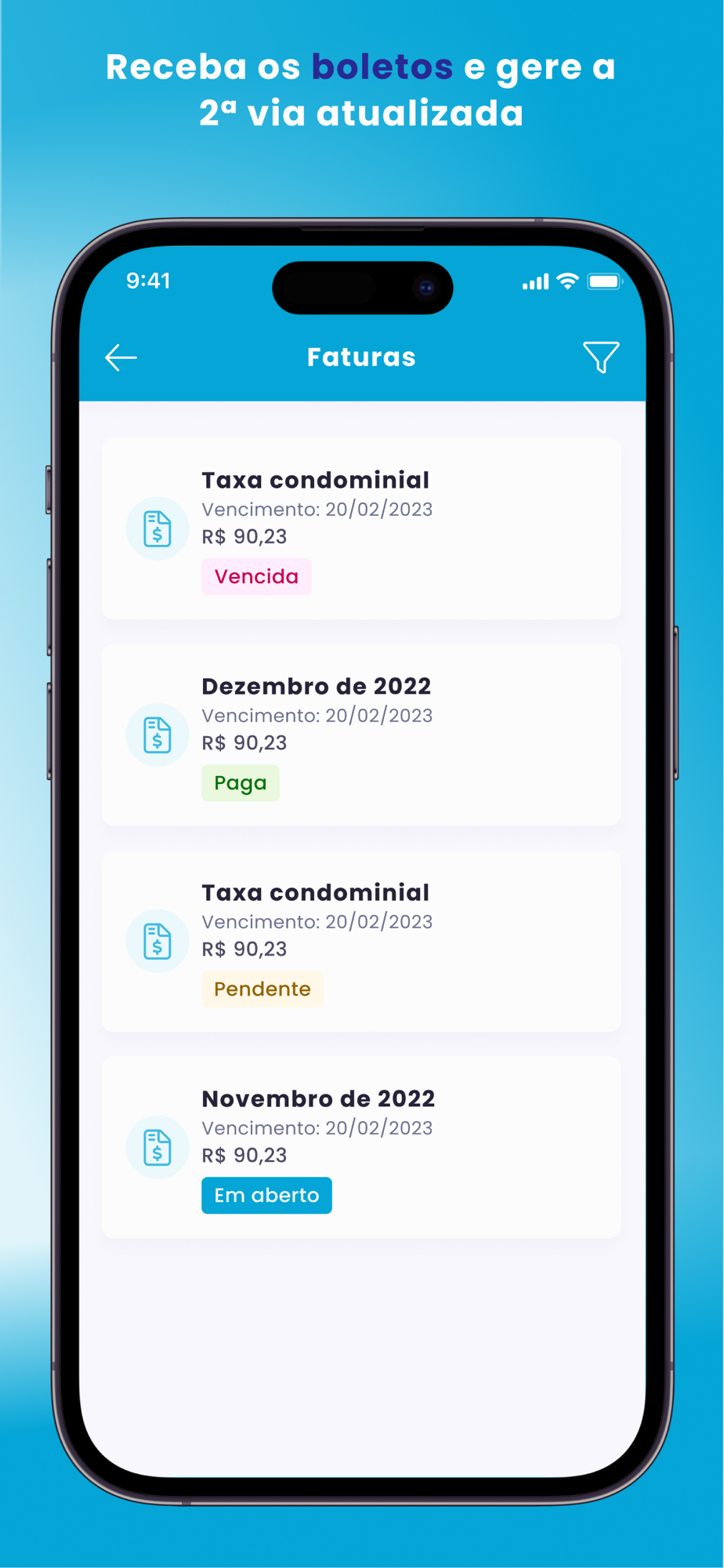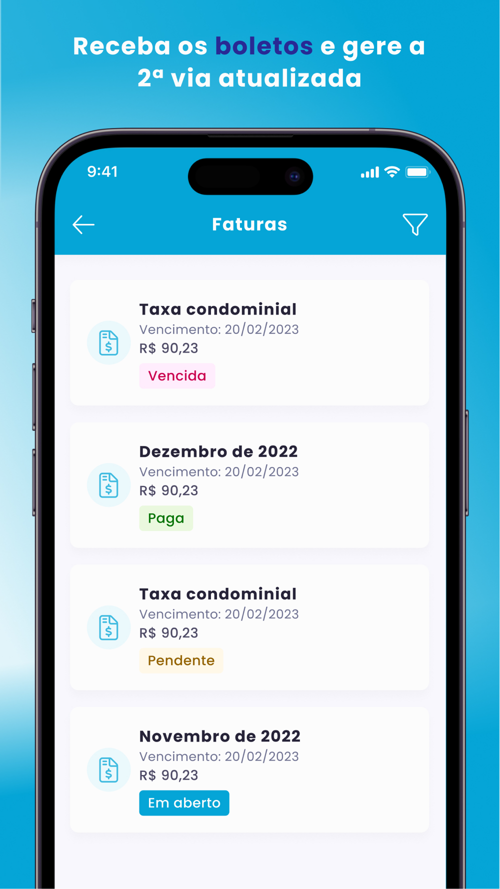 • FATURAS: Receba a taxa condominial pelo app e com 1 clique copie o código de barra para pagar em seu Internet Banking. Venceu? Sem problemas: gere a 2ª via e pague na hora! Chega de boletos em baixo na porta ou horas no telefone para gerar uma 2ª via.