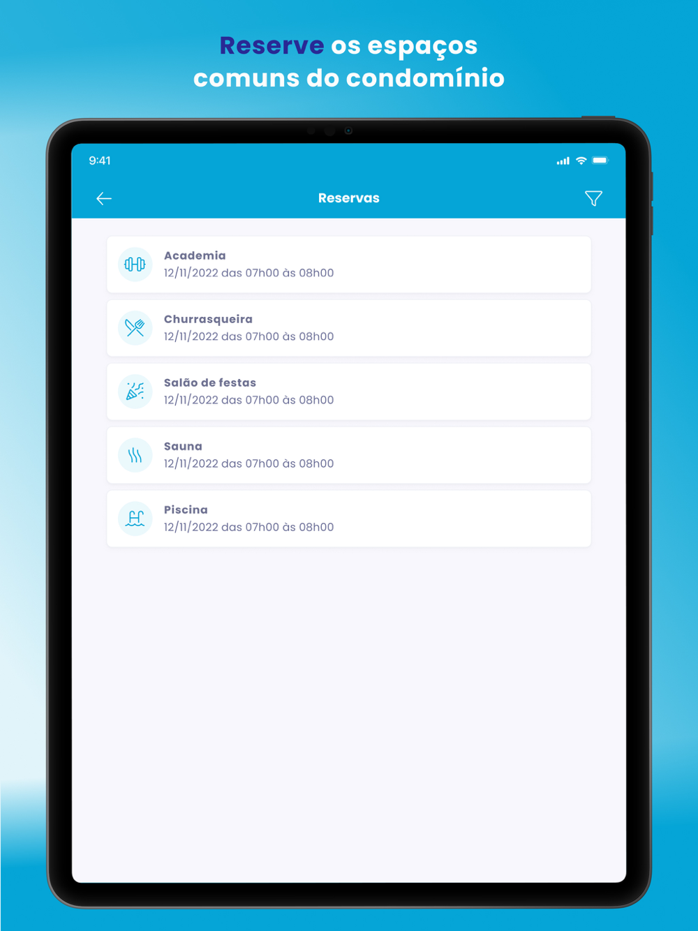 • RESERVAS: Moradores realizam reservas dos espaços comuns (churrasqueiras, salão de festas…) através do app Grupo Peres. Chega de ligar na portaria ou síndico para consultar a agenda dos espaços.