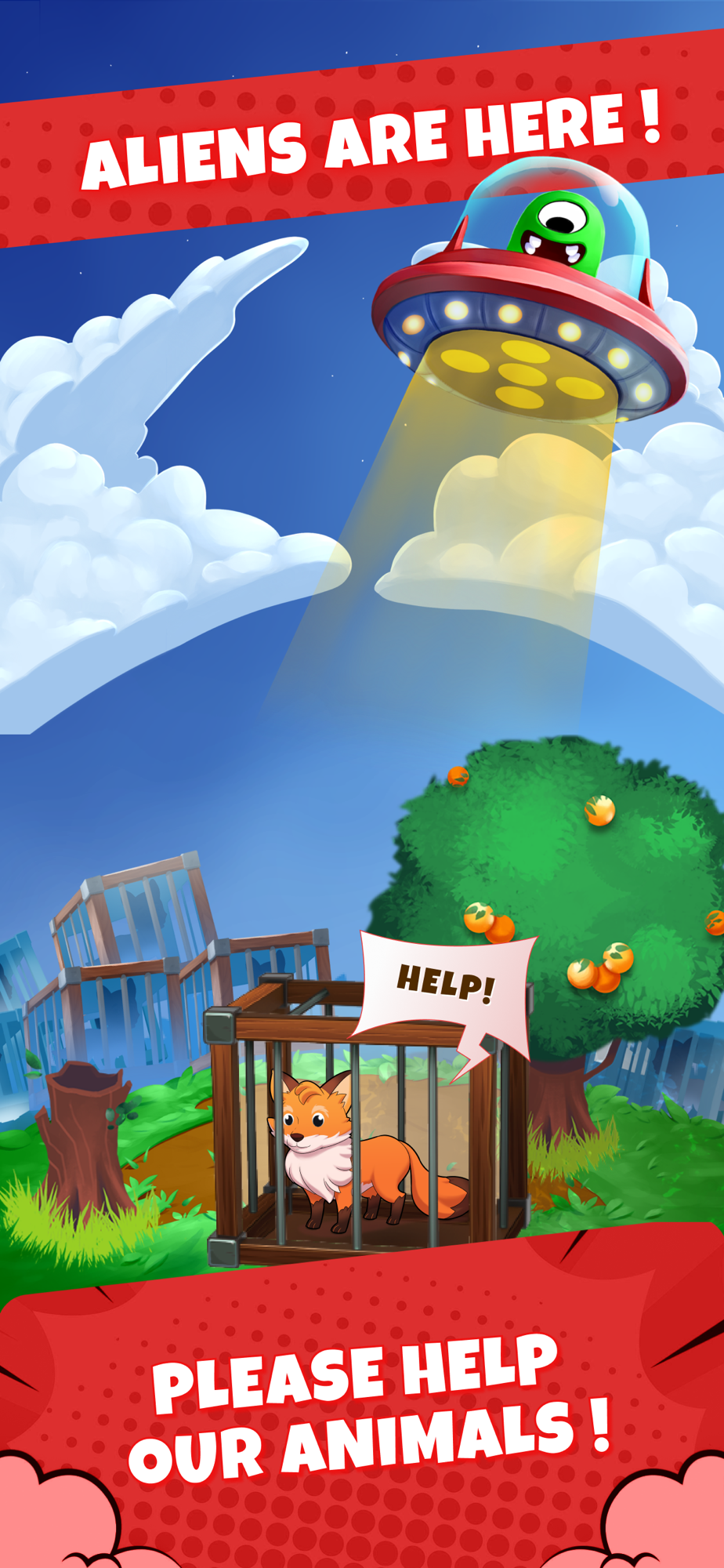 The cunning aliens will try to steal a few of your pets every day. Now is the time to fight back! Rescue your pets and get the treasure chests from their spaceships! The chests contain a variety of useful items and even shiny gems!