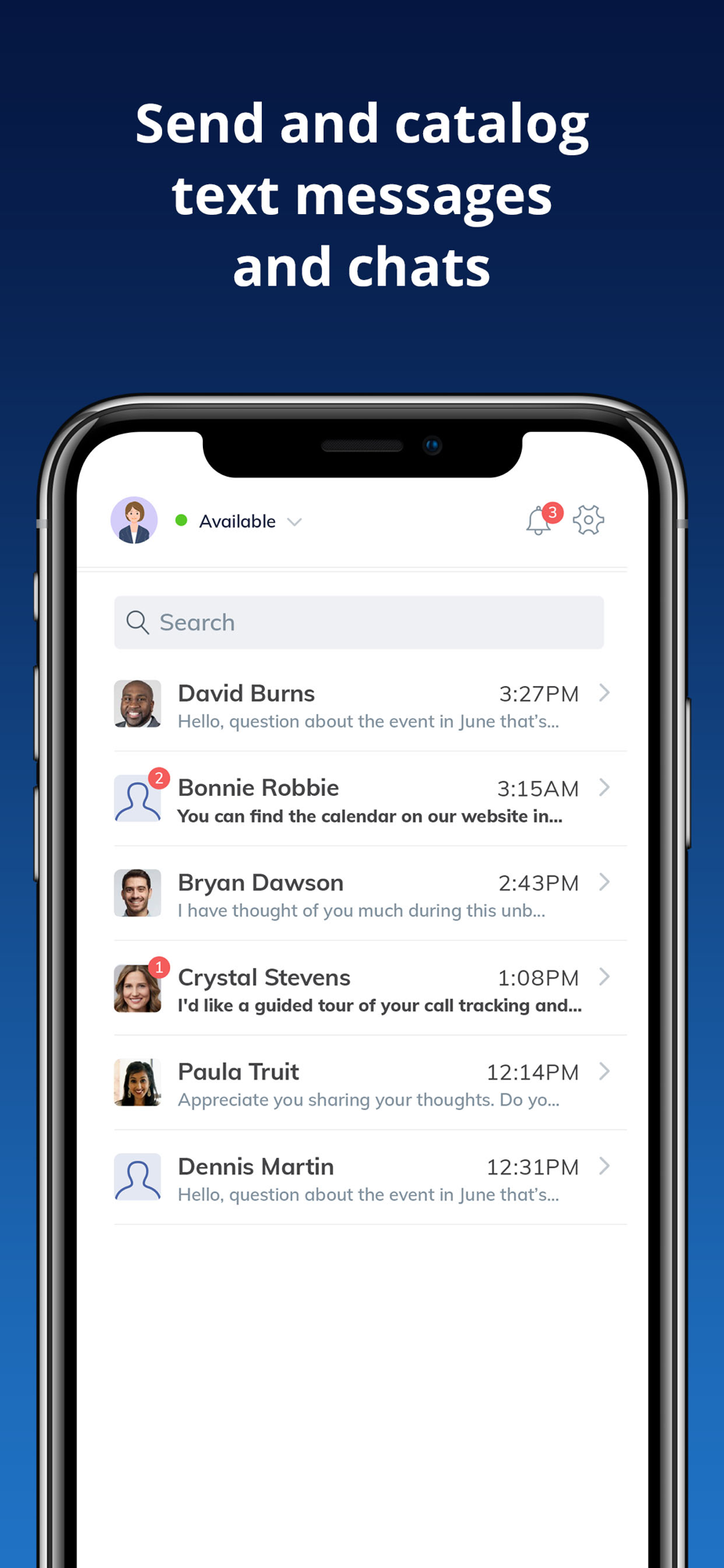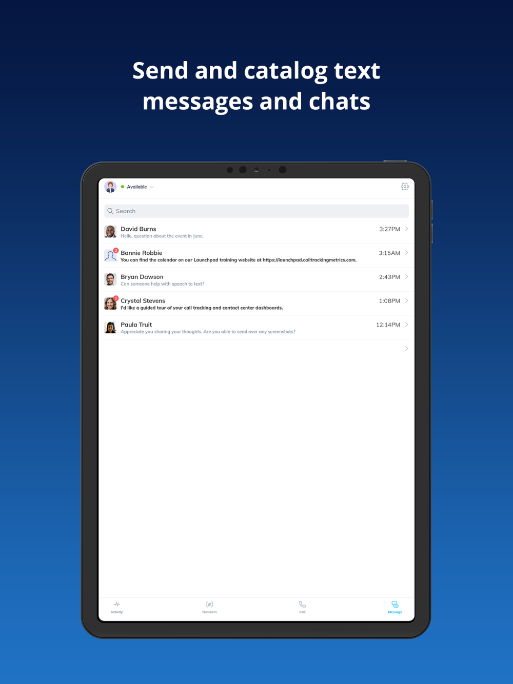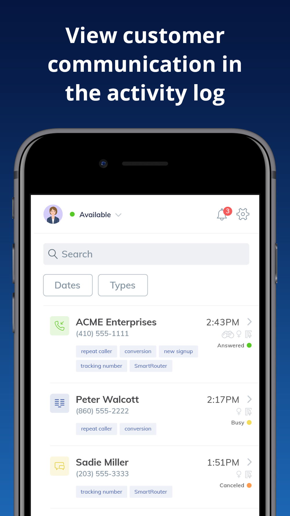 The CallTrackingMetrics Agent App allows you to manage the inbound phone calls coming from all of your advertising channels. Answer calls, texts, and chats directly from your mobile device. You’ll also be able to make outbound calls, receive push notifications for incoming live chats, return a call or text message, and take notes or read from a script while on a live call, all within the app.