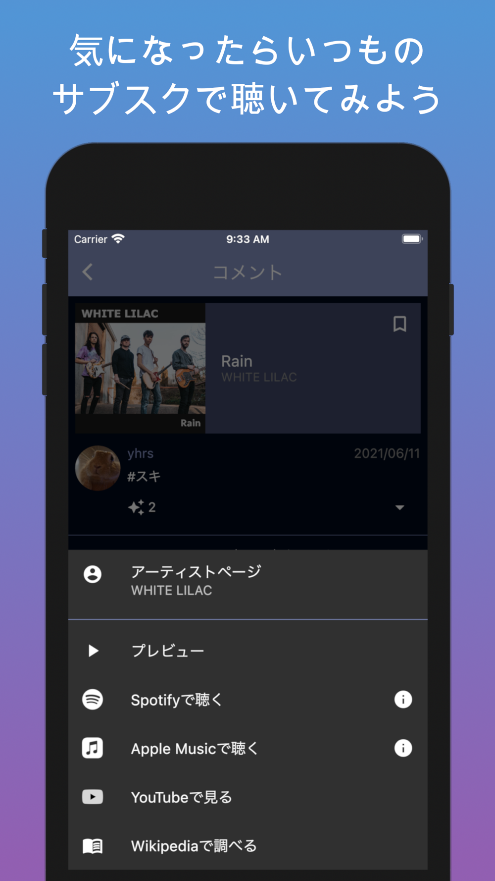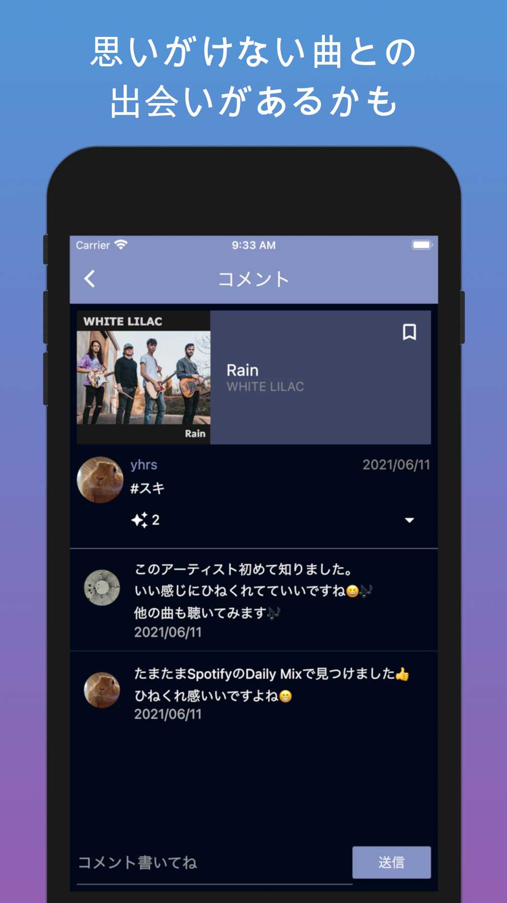SpotifyやApple Music、普段使っているサブスクサービスと連携して、友達と好きな音楽をおすすめし合ったり、今聴いてる曲を投稿したり、音楽談義ができるアプリです。