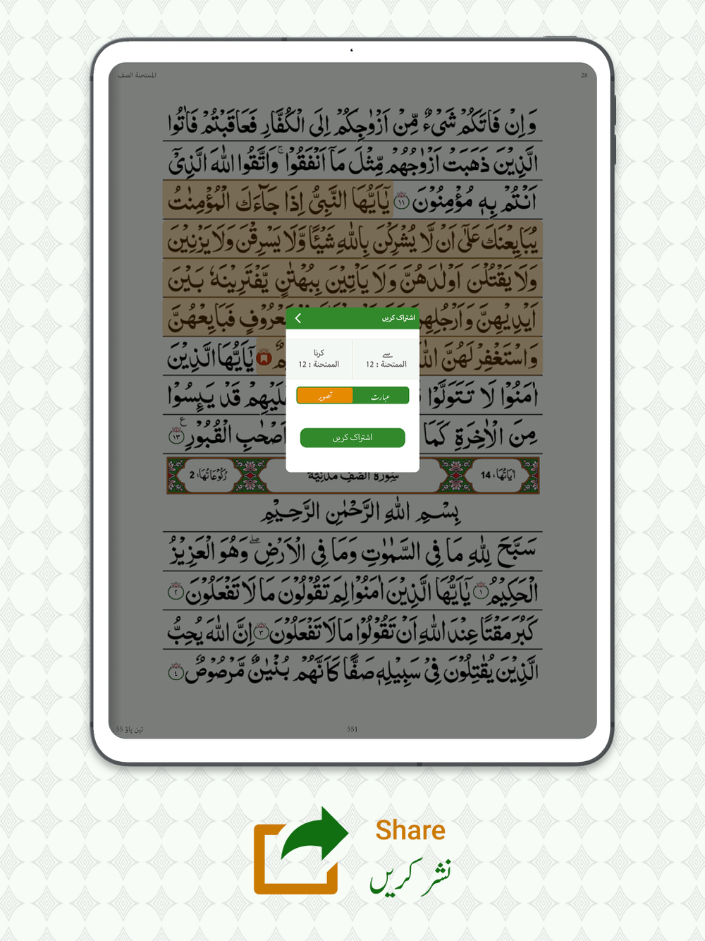 - Displaying two pages of the Qur’an on the iPad like printed copy of the Quran.