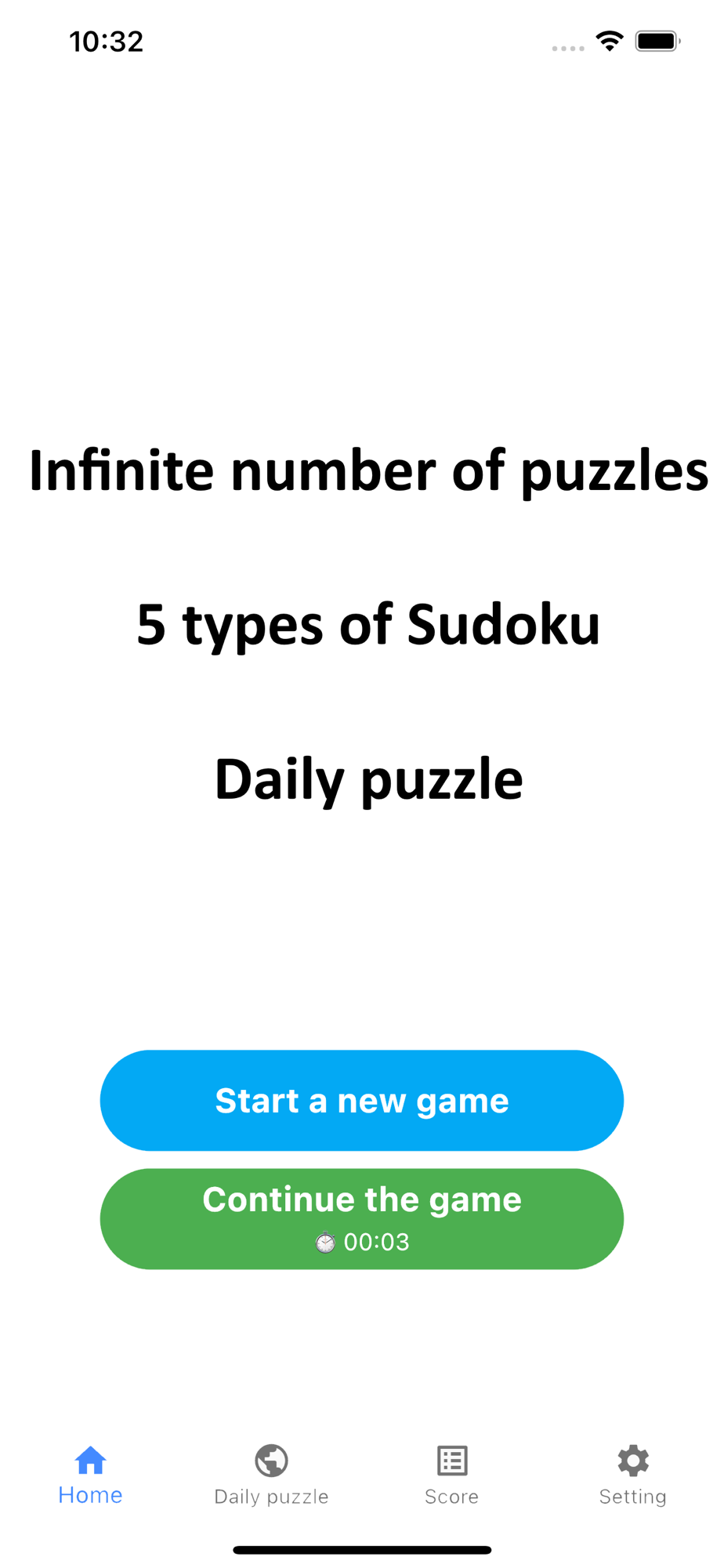 You can play 5 types of Sudoku games.