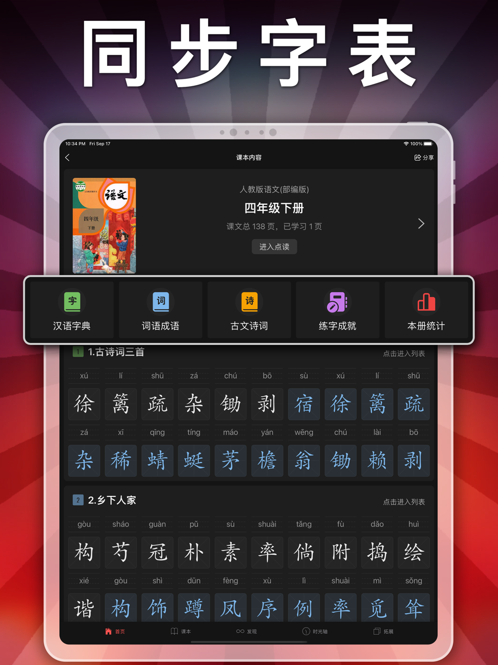 6、小学语文同步学、笔画笔顺书写练字功能;