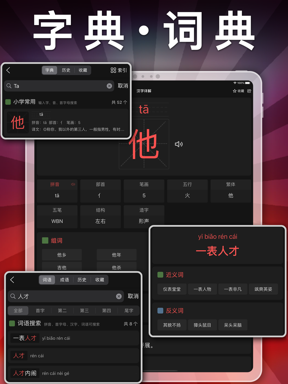 3、汉语字典、拼音、笔画、边旁部首搜索功能;