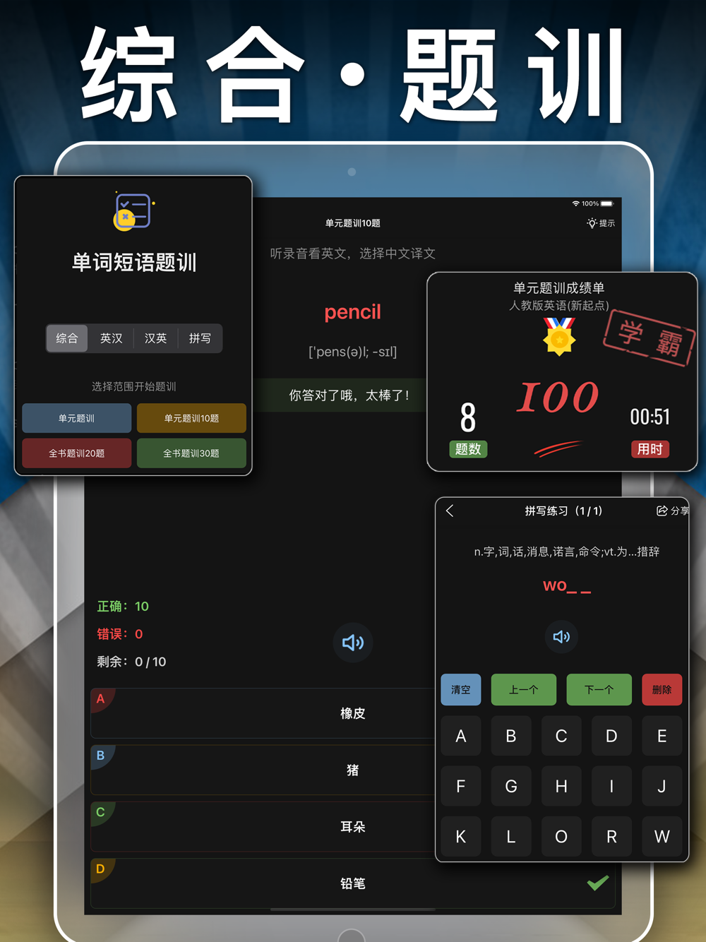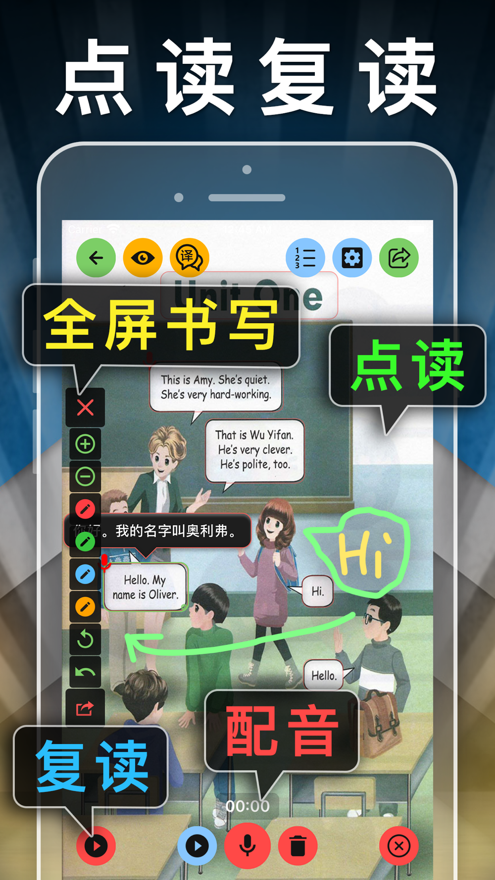 功能特色:同步点读、趣配录音、全屏手写、单词训练、词语测验、学习成就