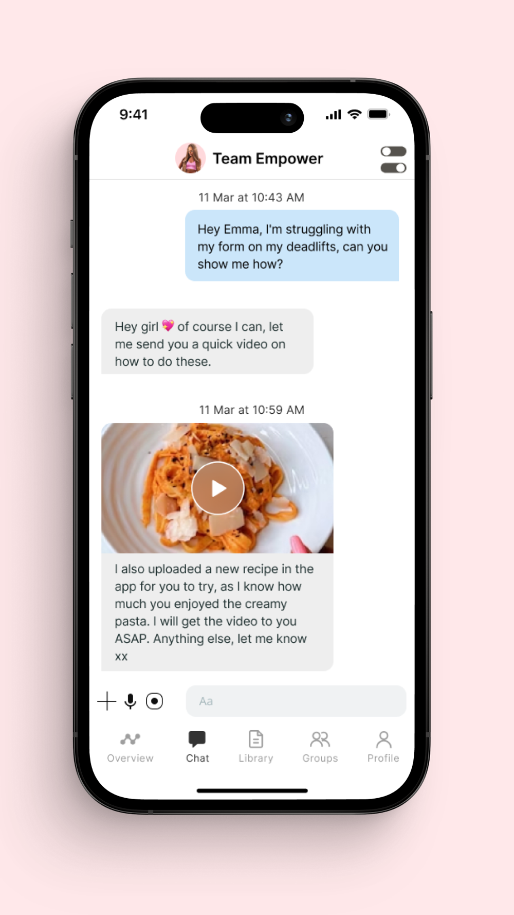 Moreover, the app contains a chat feature where you will be provided with continuous support from Emma via message and voice note; in addition to regular lesson videos to educate you on different topics surrounding health, fitness, nutrition and more. You can communicate with Emma through the in app messenger as much or as little as you like.