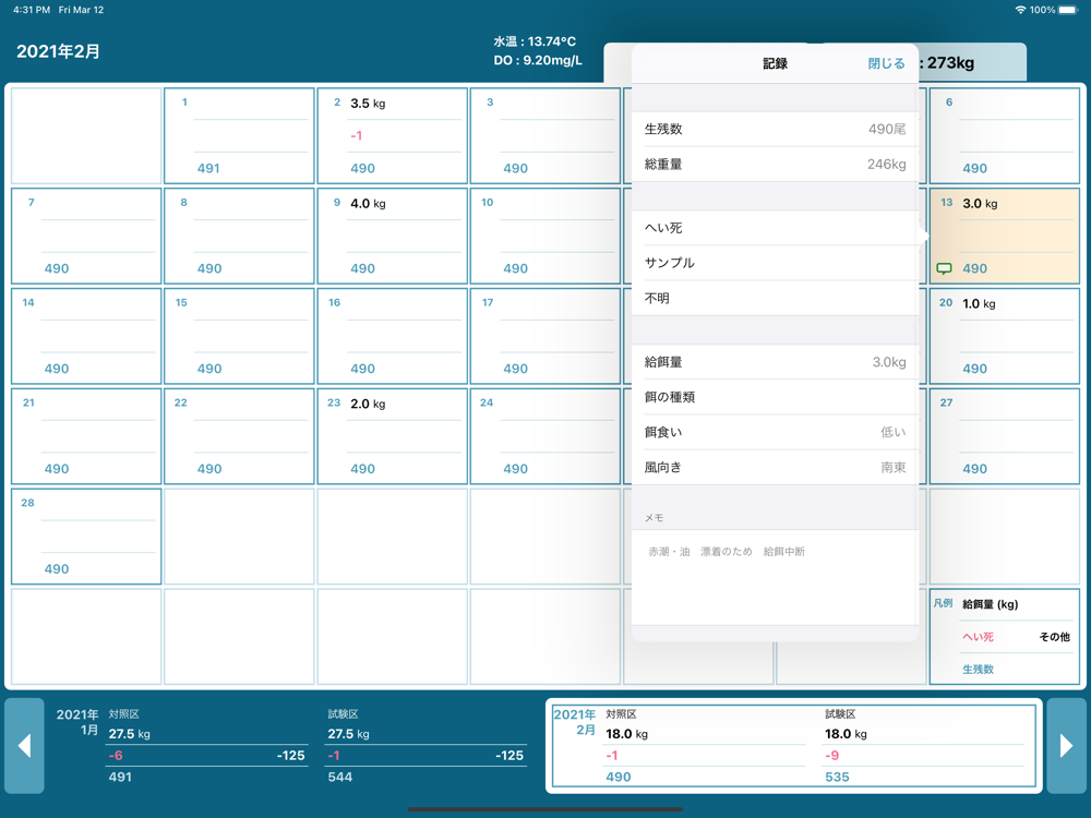 入力モードでは、給餌量やへい死などの日々の作業履歴に加えて、入荷や出荷の移動履歴、体長や体重の計測履歴を入力することができます。閲覧モードでは、すべての履歴の参照に加えて、給餌量とへい死をグラフで参照することができます。2つの生簀を独立して管理することができます。