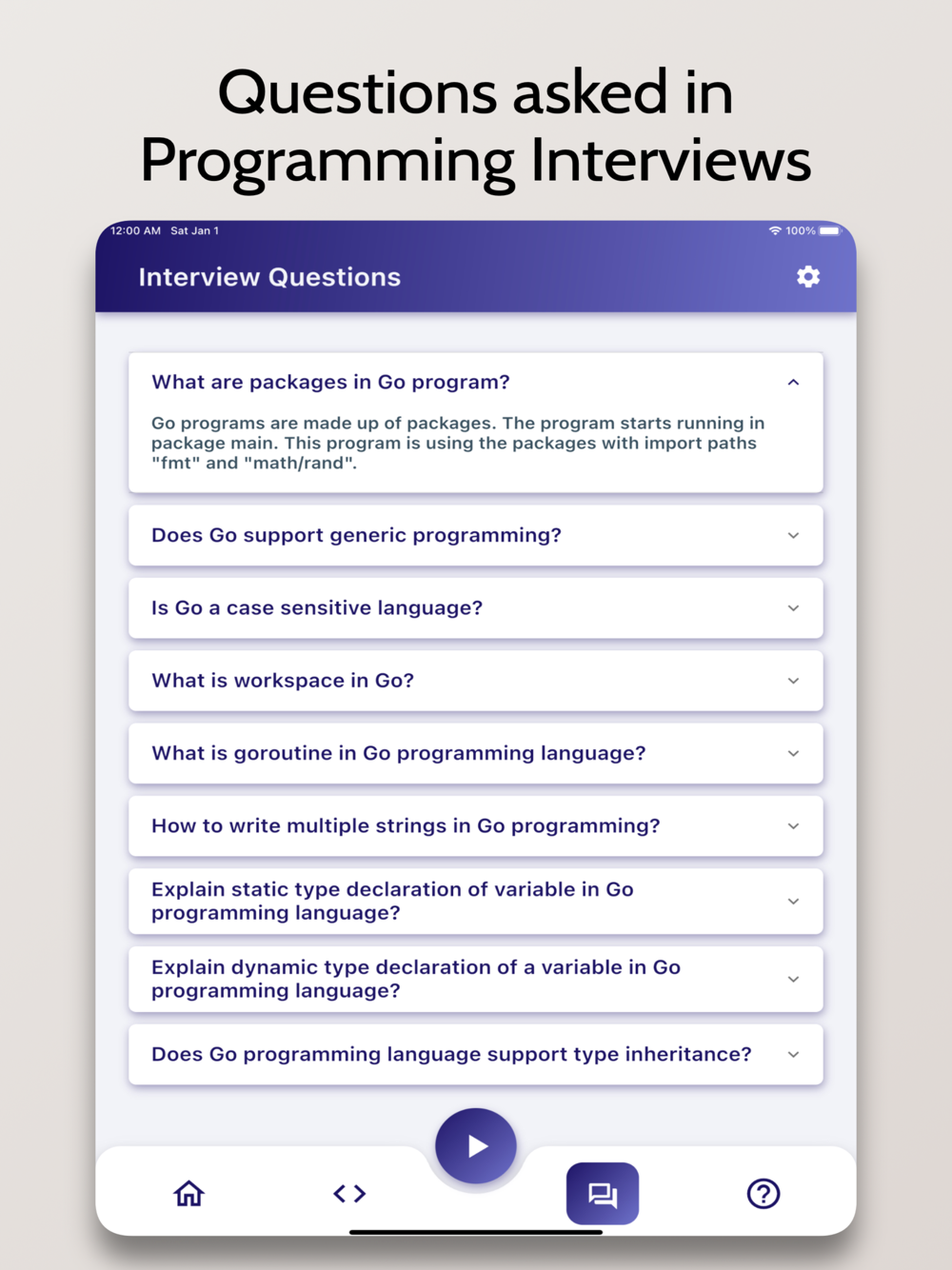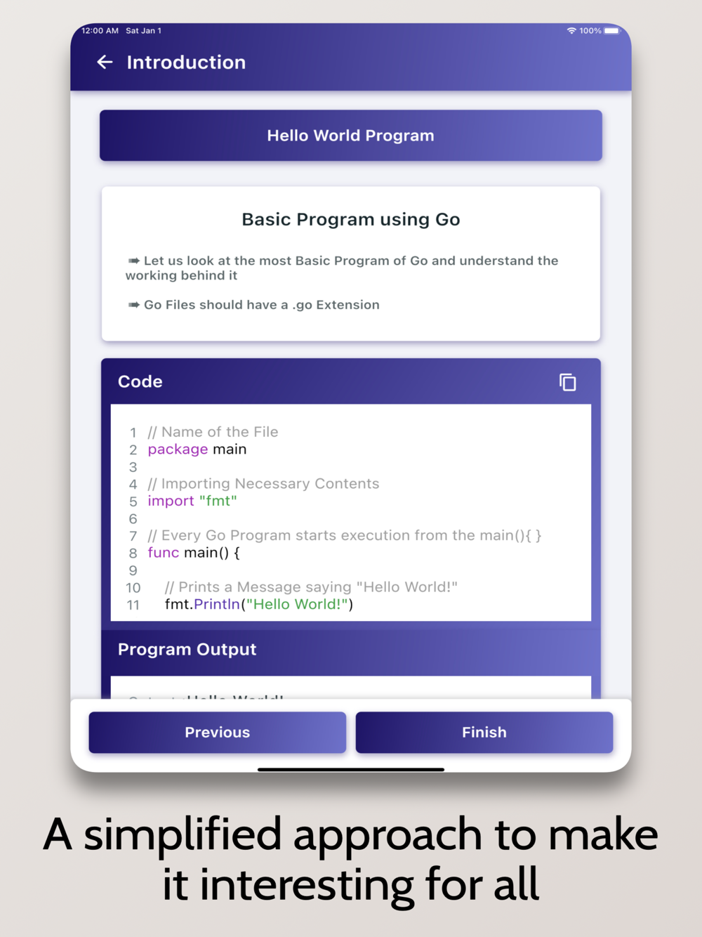 Whether you want to learn Go Programming as a Hobby, for School/College, or want to build a Career in the field, this Tutorial is for you. The tutorial covers everything from the Basics of Programming to Advanced Concepts like Data Structures. It also comes with a sleek and interactive graphical user interface.