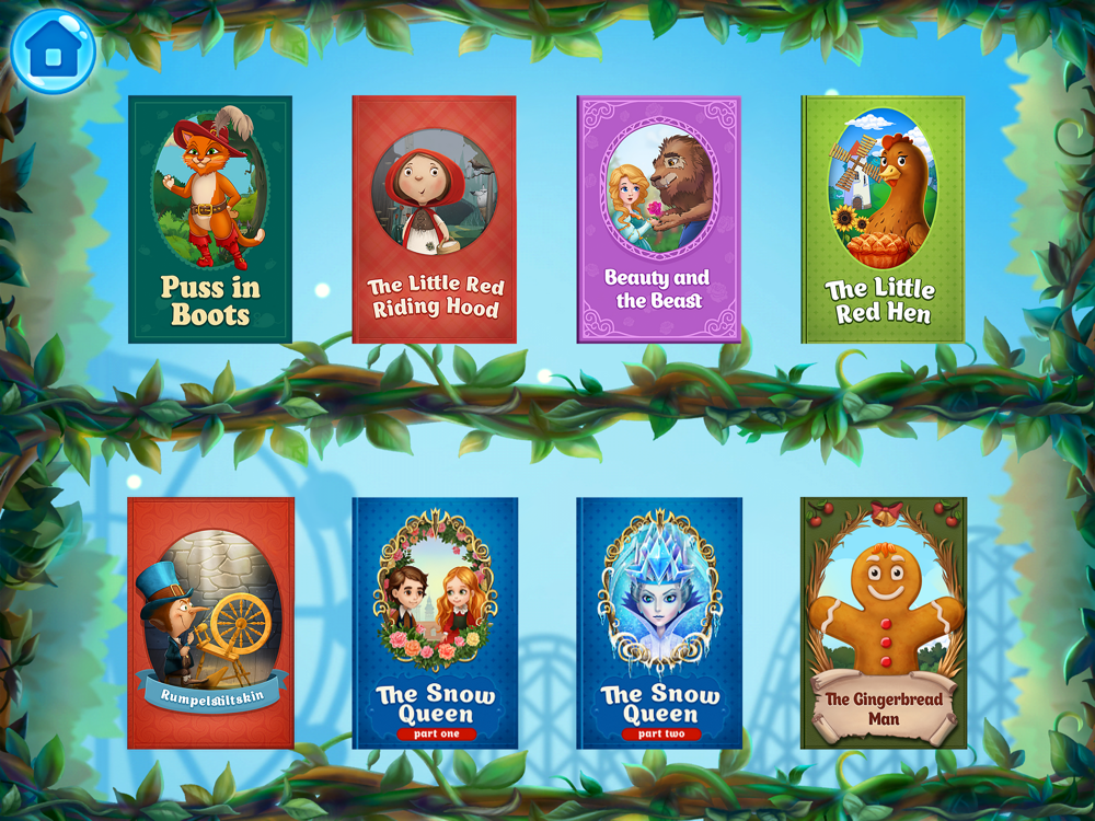 Experience the magic of fully narrated fairy tales with interactive scenes and animated characters! Read books and play educational games!