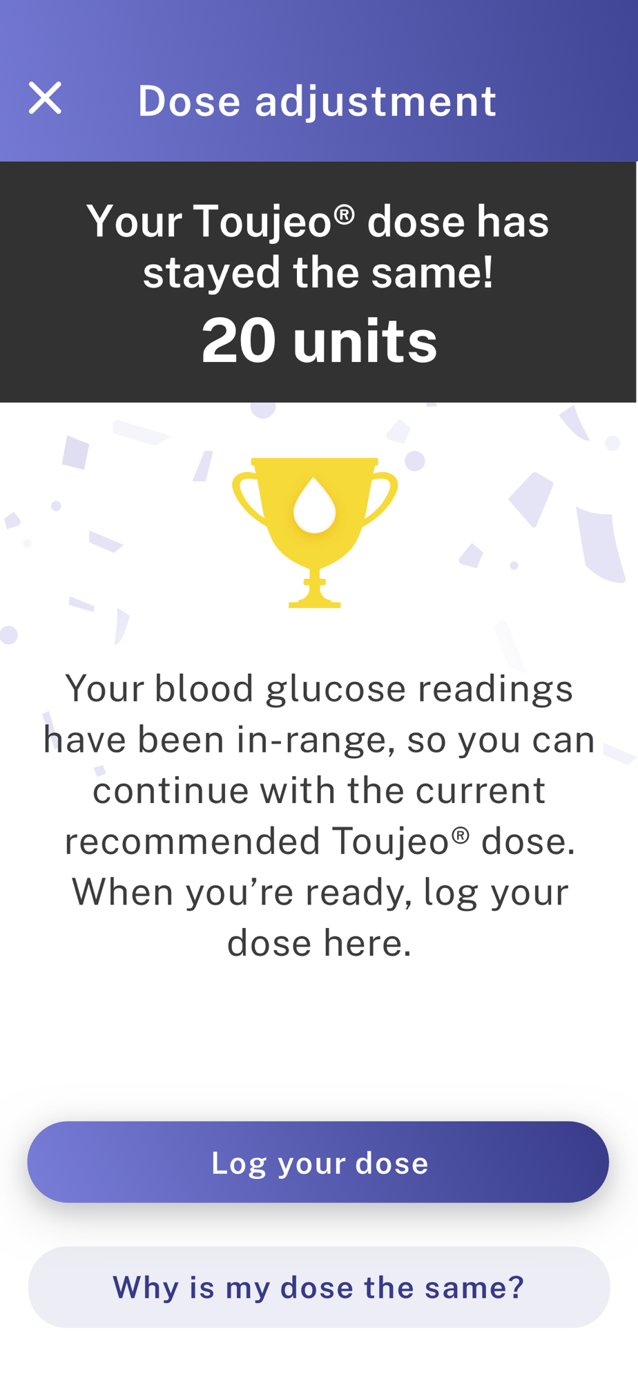 My Dose Coach™ Basal Titration is indicated for single patient use for adult patients with Type 2 diabetes who have been prescribed and are using a once-daily long acting (basal) insulin. My Dose Coach™ is a tool that calculates a dose change based on an individualized dose plan the healthcare provider has created. My Dose Coach™ is not intended to replace the healthcare professional's care or advice. Patients should talk with their healthcare team if they have questions about their treatment. For more information about the My Dose Coach application, please contact the Sanofi customer support center in your country.