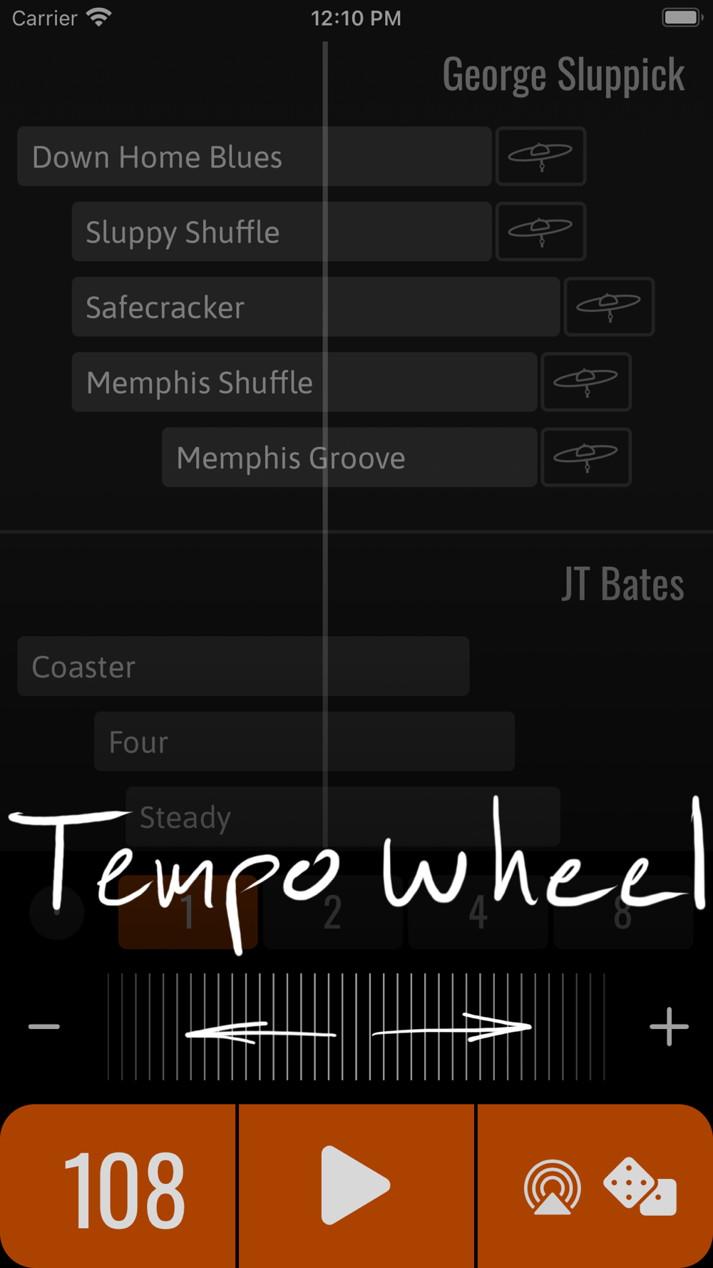 Each drummer recorded a special set of beats for Wheelhouse, and played those beats all the way from stone-cold slow to smoking fast. Wheelhouse stitches these together so you can play any tempo in between.