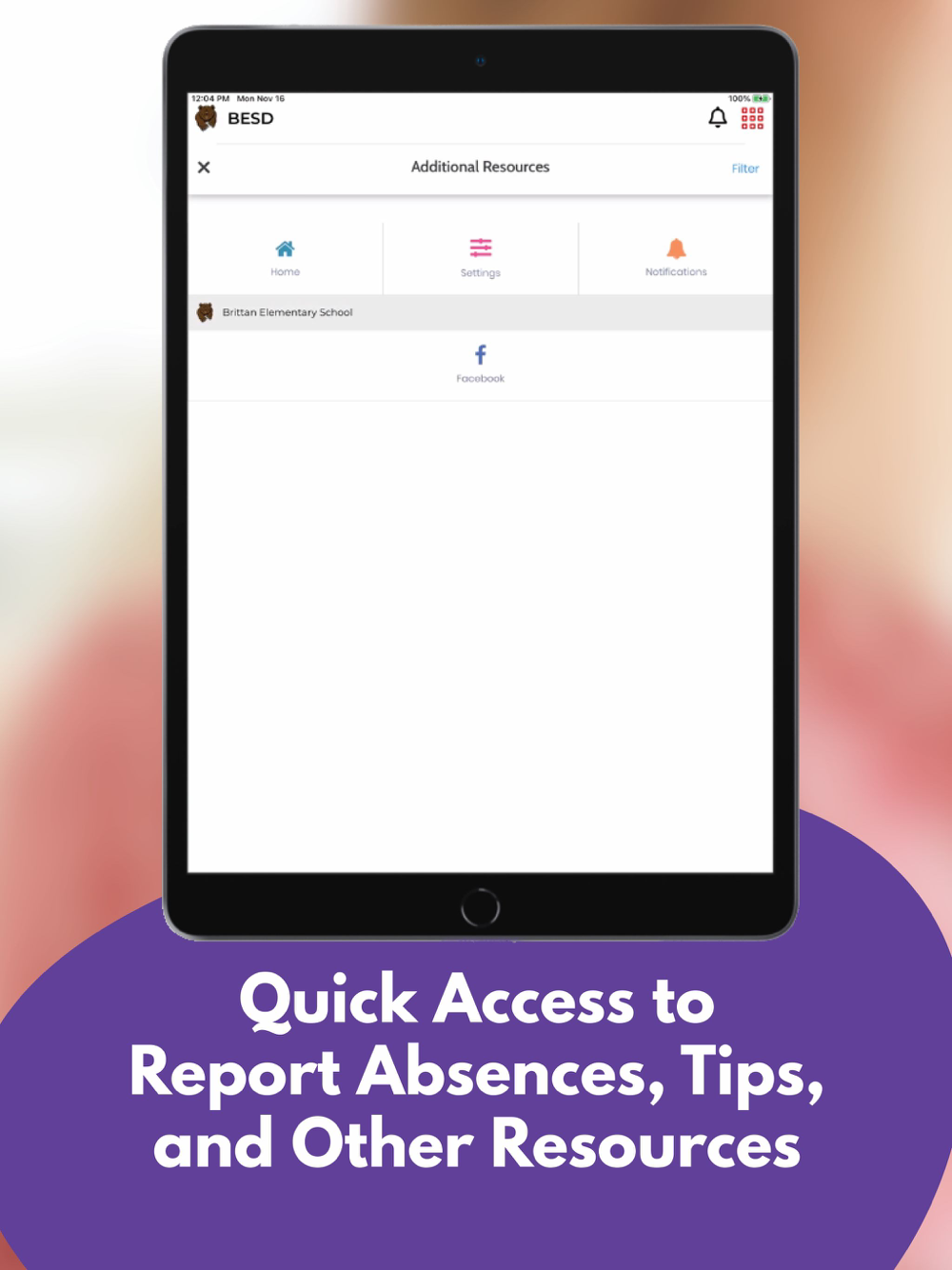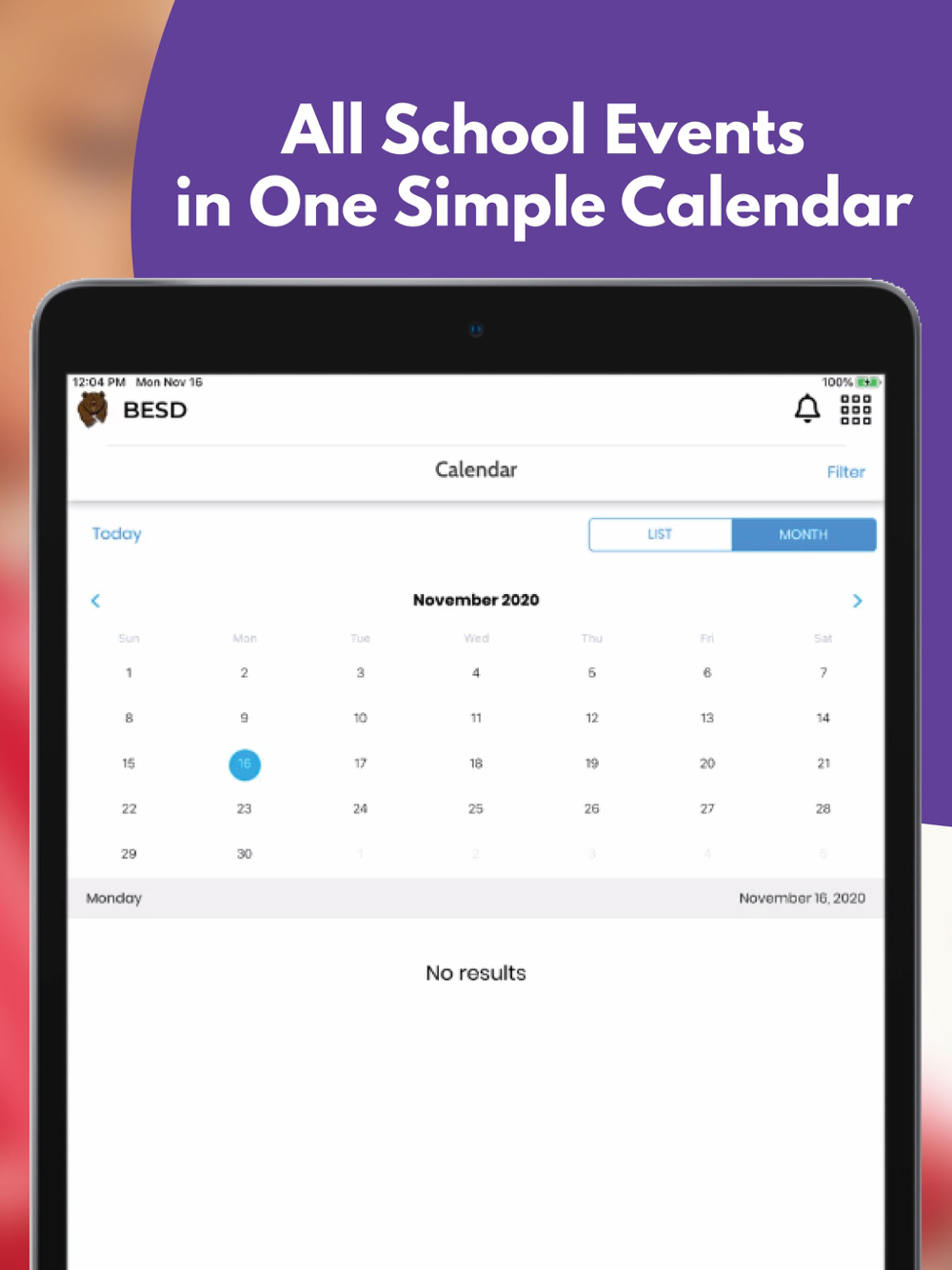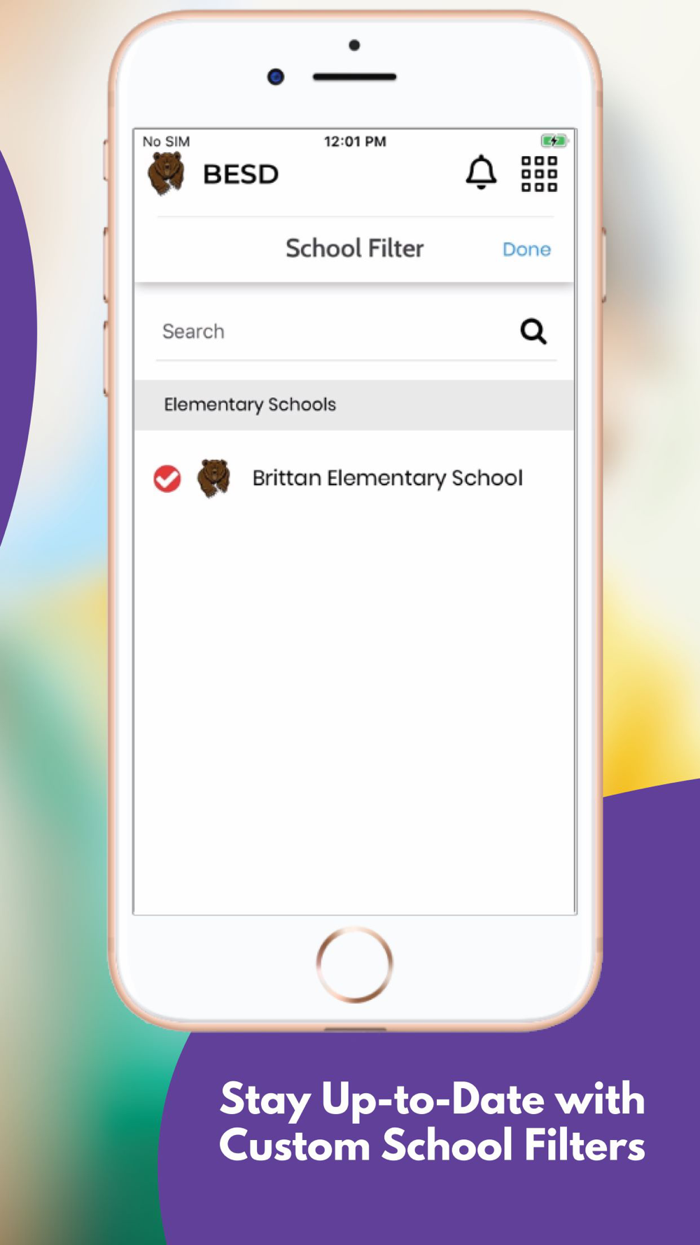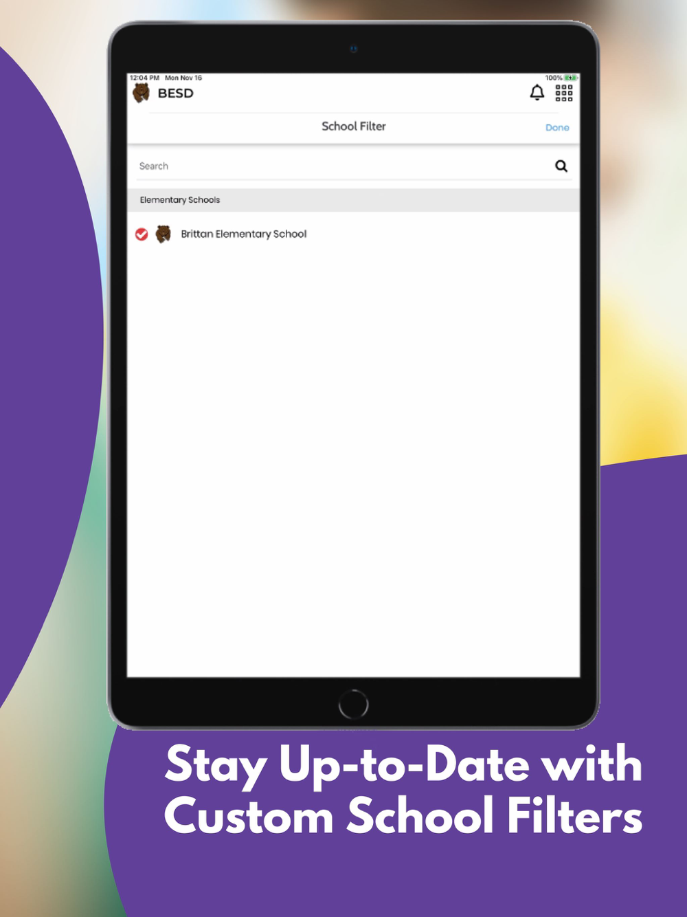 The app includes information for the district and all schools. Filter by the school your child attends to feature information for that school.