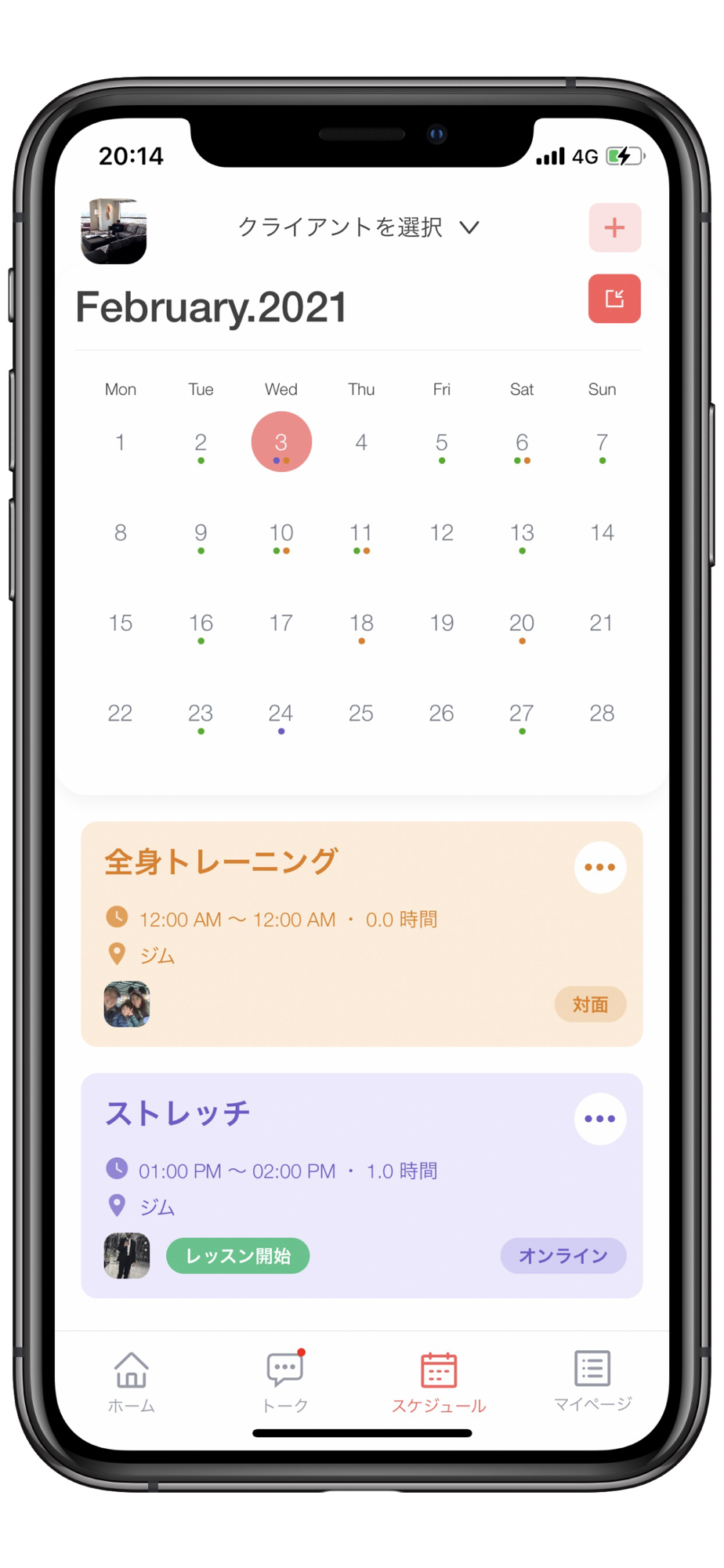 ■スケジュール管理機能 クライアントのスケジュールを一括管理。ホームワーク、オンラインレッスン、対面レッスンをまとめて表示して、クライアントのトレーニングを効率よく管理することができます。