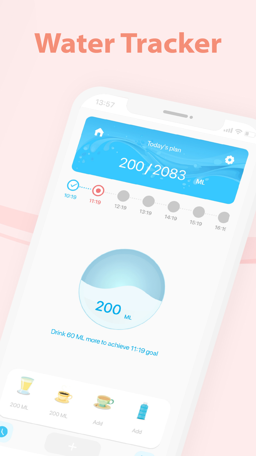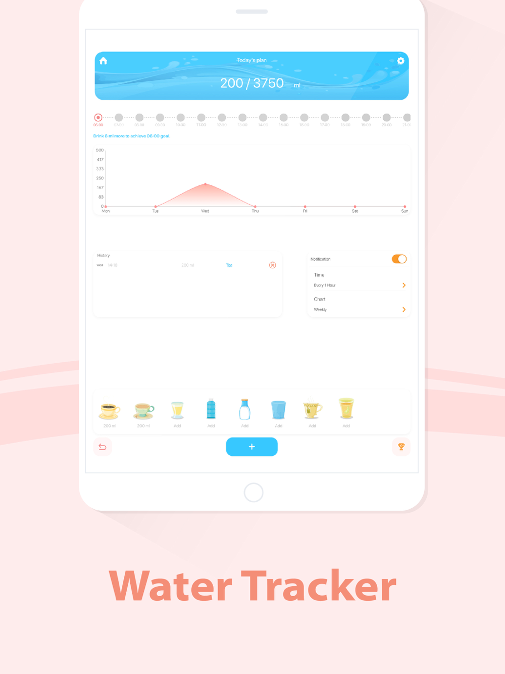 在水部分,您可以管理24小時的飲水量。此部分(例如,創建飲料管理計時器,即時消費公告欄,成就等)可幫助您最好地管理每日的液體攝入量。