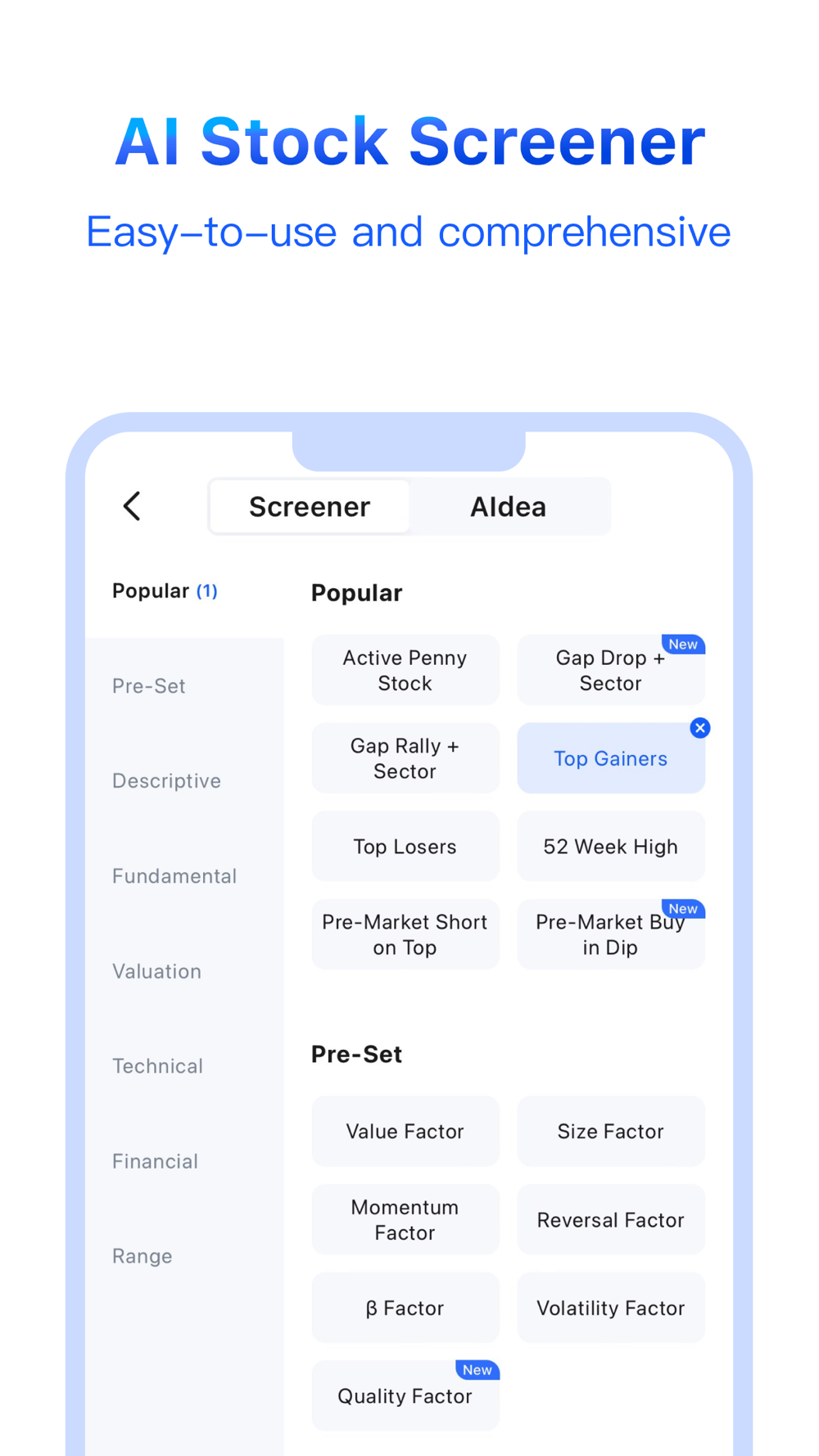 - Easy-to-use and free, comprehensive stock screeners based on AI recommendations.