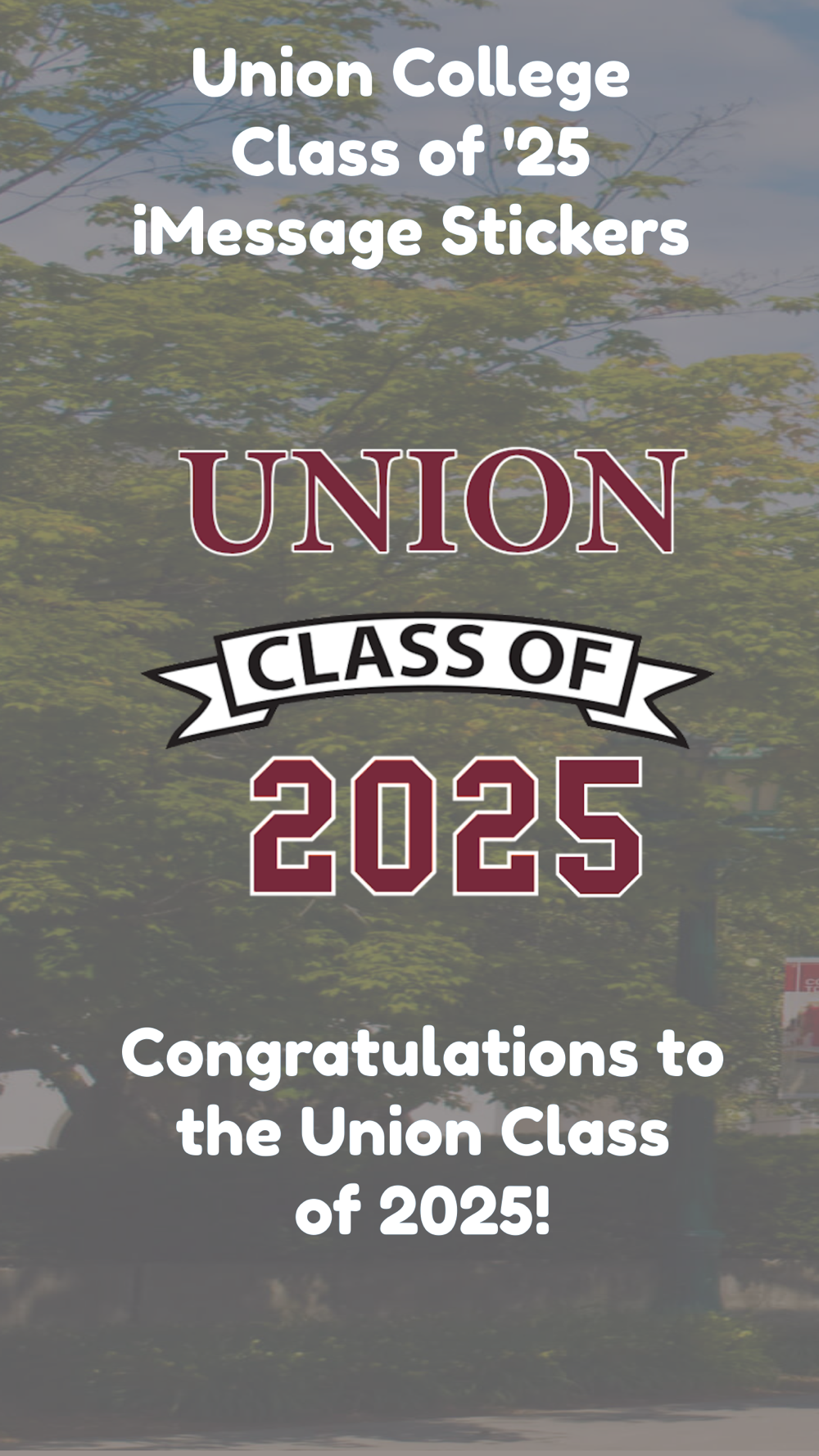 Congratulations to the Union College Class of 2025! This iMessage application lets you celebrate your admission to the class of 2025 by adding Union College branded static and animated Class of '25 stickers to your text and photo messages on iMessage. Text a sticker to your friends and classmates, or drag a sticker onto an existing message thread and represent yourself and Union College!