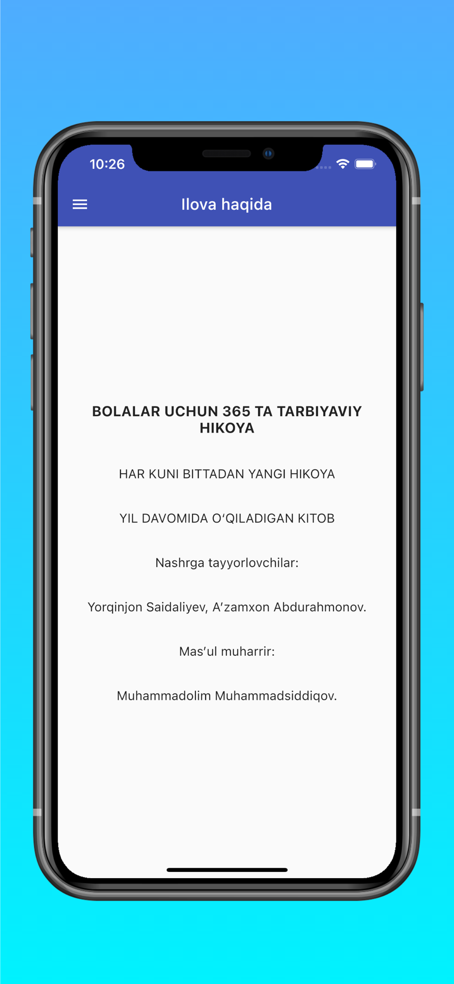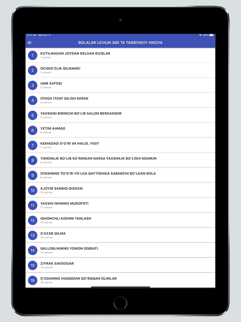 Ushbu mobil ilova o'z ichiga 365ta bolalar uchun tarbiyaviy hikoyalar to'plamini oladi. Hikoyalar nabaviy ahloq, ota-onaga itoat kabi qissalarni o'z ichiga oladi.