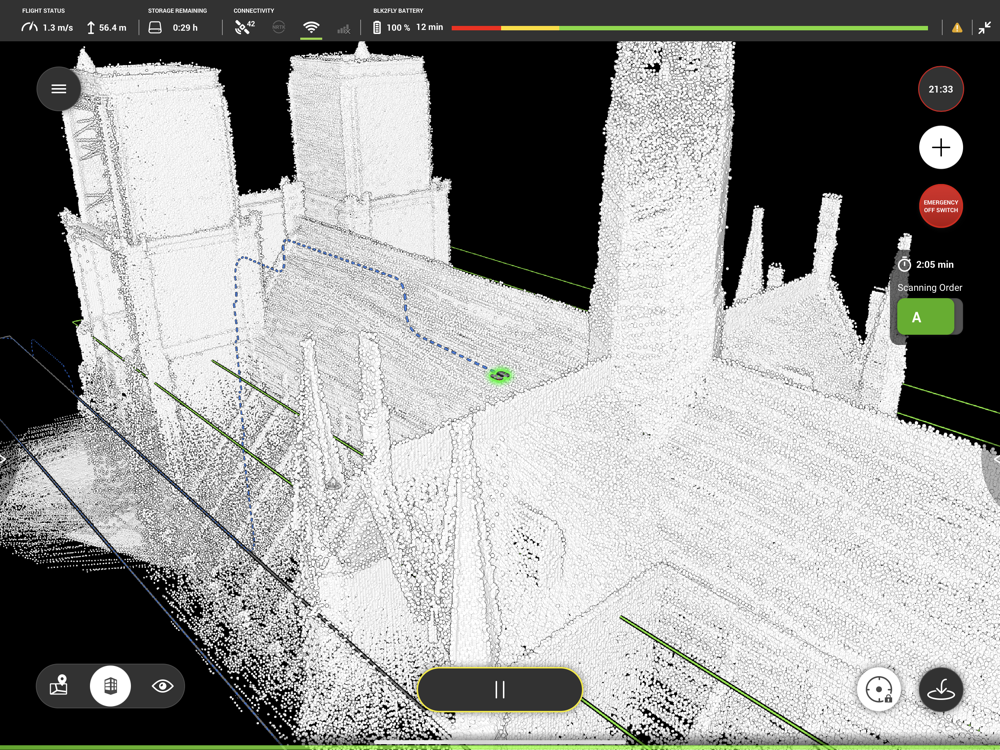 The app serves as an easy and intuitive interface towards your BLK2FLY and lets you control its scan flights including the ability to plan and run autonomous scan missions. A spherical live video stream and a 3D preview map of the environment allows to monitor the scan progress in real-time.