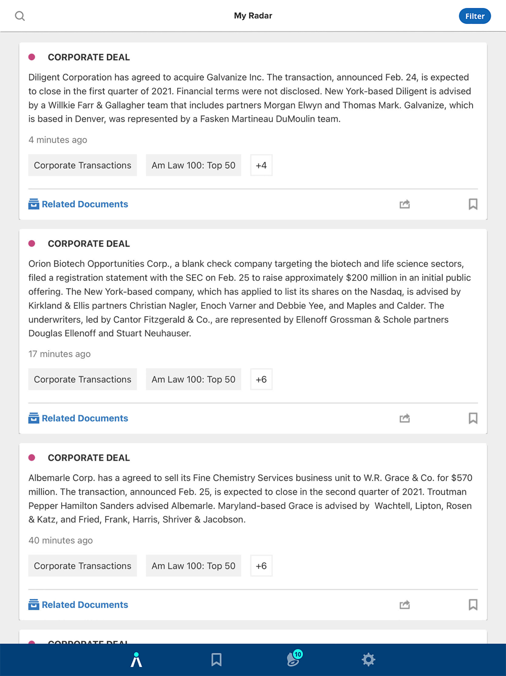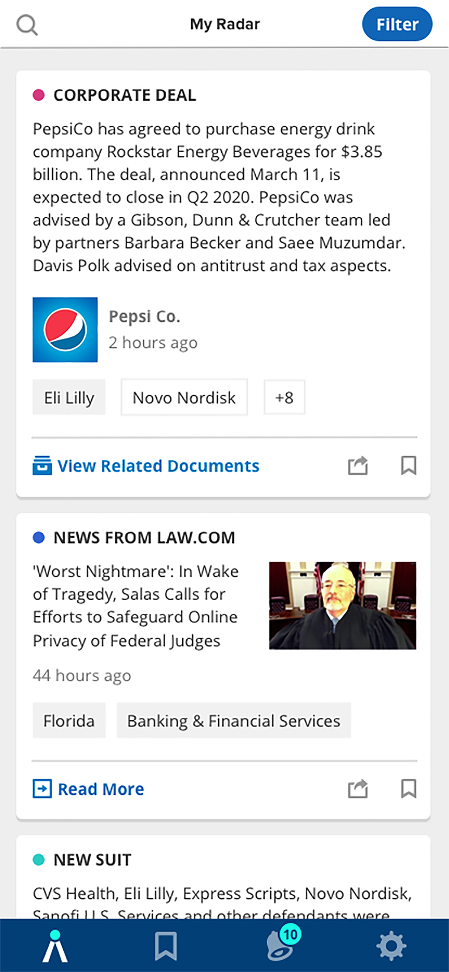 Law.com Radar is a personalized legal news feed that provides the ability to be first to know what’s driving new suits and deals in key industry segments. Powered by high-speed technology and ALM’s global newsroom, each Radar update delivers the vital information that legal professionals need to take action, generate business and advise clients hours ahead of other sources.