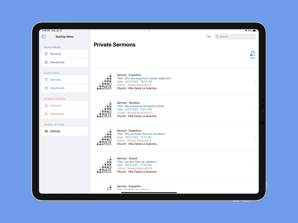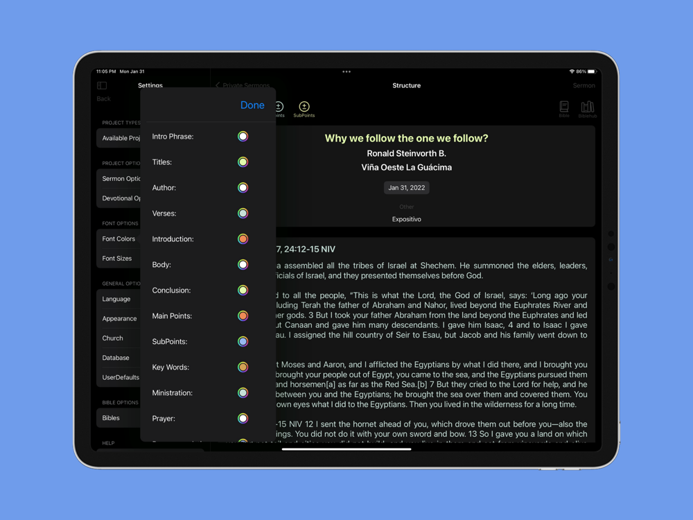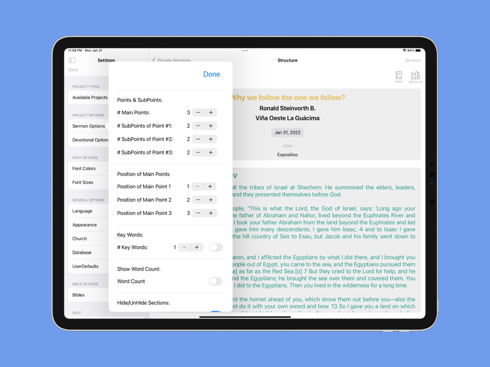 Sermon Maker is an app to build sermons and devotionals. This app is compatible with iPhone using iOS 15.0 or later, iPads using iPadOS 15.0 and later and macOS 12.0 Monterey and later. The macOS app is compatible with Intel Chips using Mac Catalyst & Rosetta. It has the ability to save the projects into iCloud synchronizing with all devices compatible with iCloudKit using private and public databases. The app is available in English, Spanish, German, Italian, French & Portuguese languages. Work with DarkMode and LightMode within the app. It allows the user to change the color of some fonts in the different sections of the app including the sermons and devotionals. It has wordcount for each section and total words, and other features.