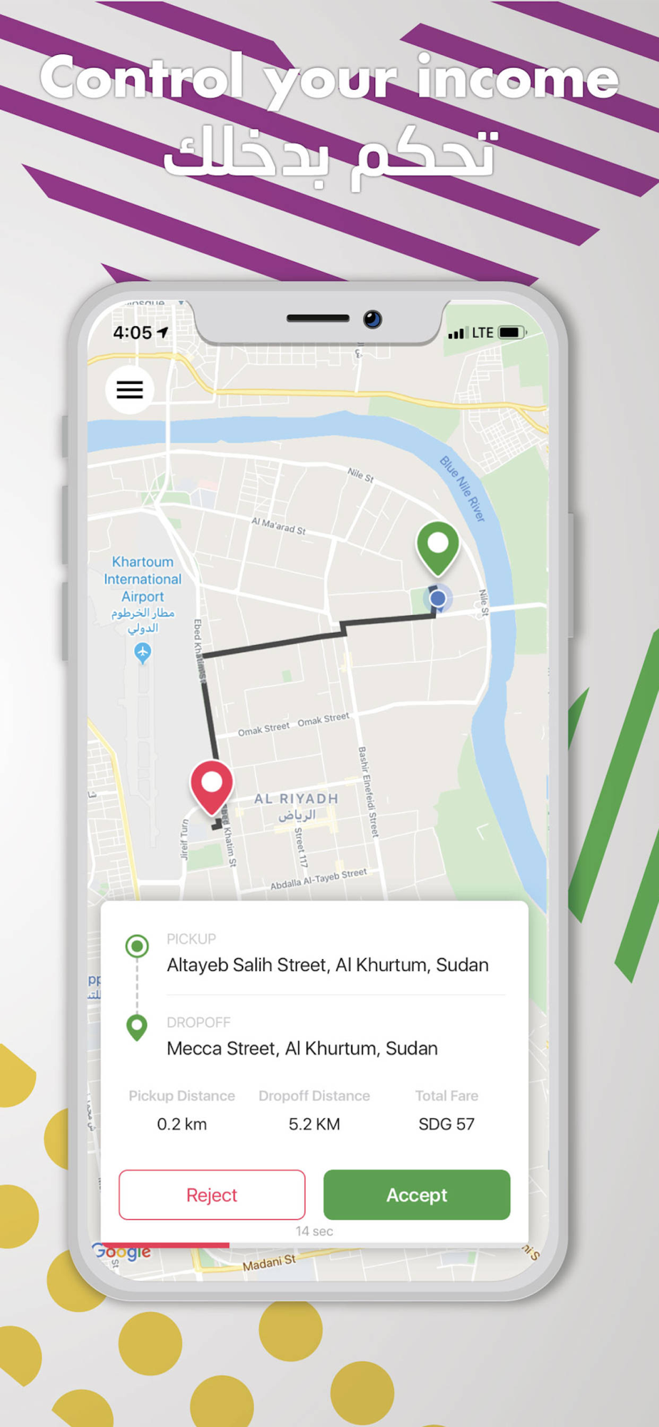 Download the app now and start taking rides requests anywhere in Capital Khartoum.