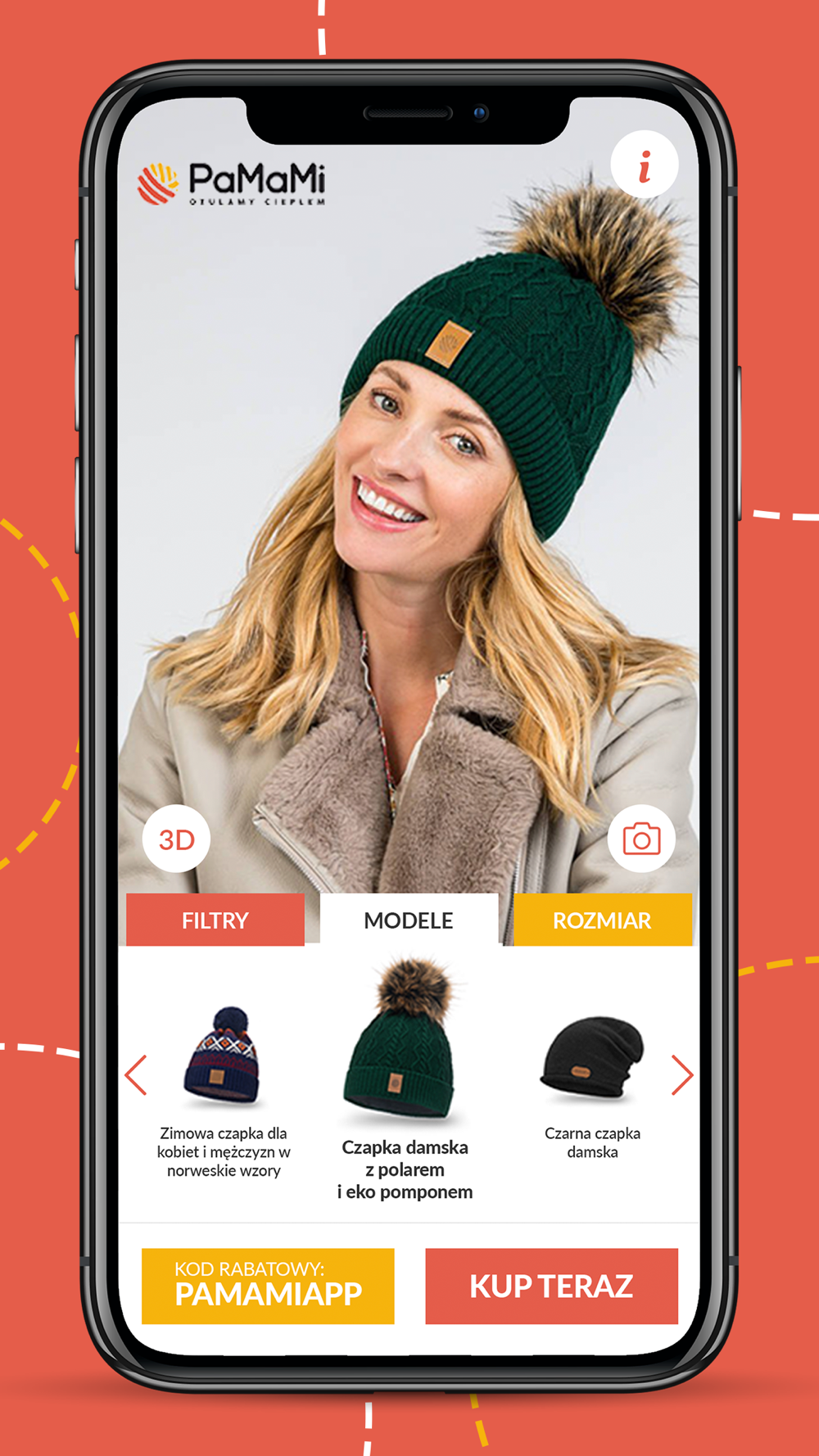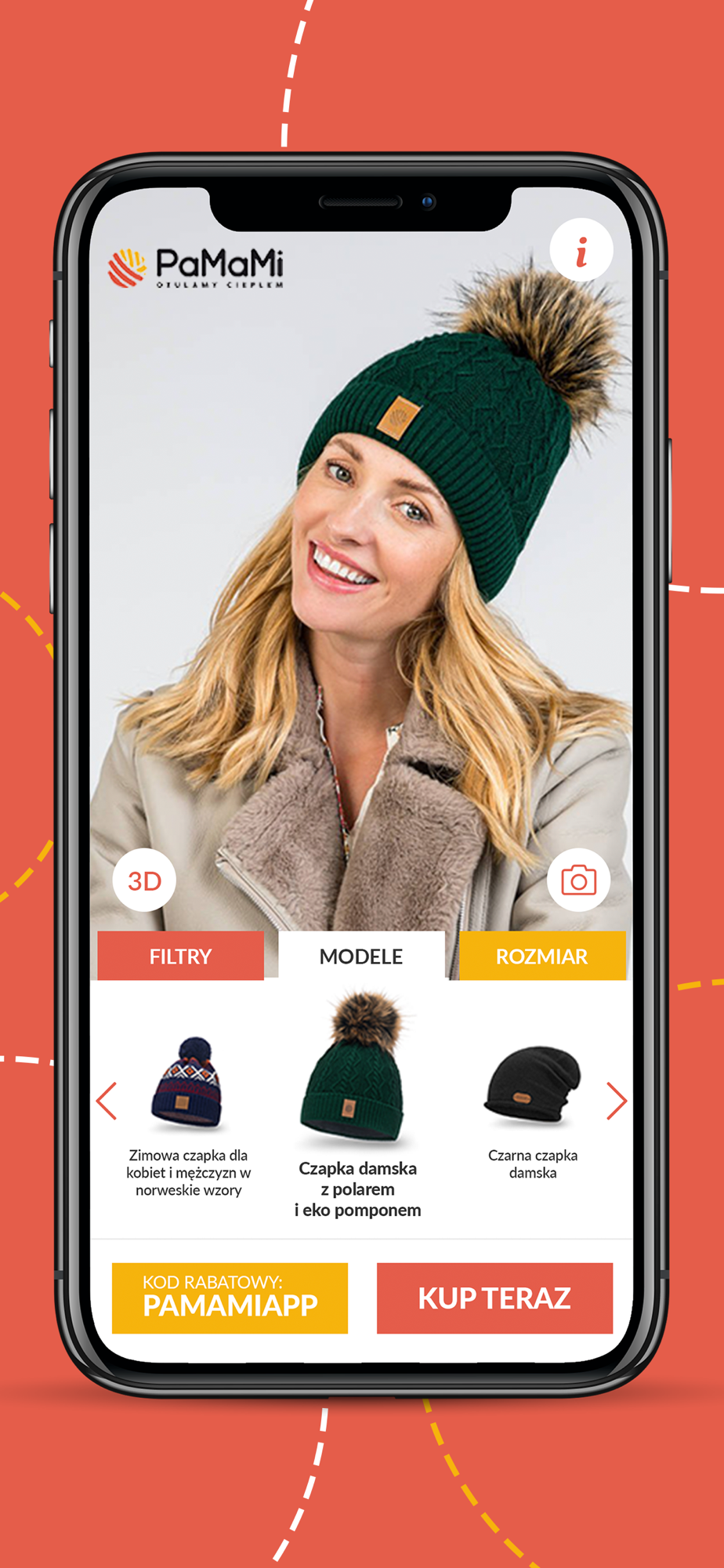 Kupowanie ubrań przez internet prawie zawsze wiąże się z pytaniem, czy dana rzecz będzie na nas wyglądać tak samo jak na modelu czy modelce? W przypadku naszych czapek nie musisz się już zastanawiać! Pobierz apliakcję PaMaMi - Fit It i zobacz jak wyglądasz w różnych modelach i wersjach kolorystycznych! Dowolnie zmieniaj rozmiar i dopasowuj czapkę na głowie, zapisuj zdjęcia w urządzeniu i dziel się nimi przez internet :) Możesz również dokładnie obejrzeć każdy produkt korzystając z funkcji obrazu 3D, a jeśli uznasz, że w którymś z produktów wyglądasz rewelacyjnie, skorzystaj z przycisku "Kup teraz" :)