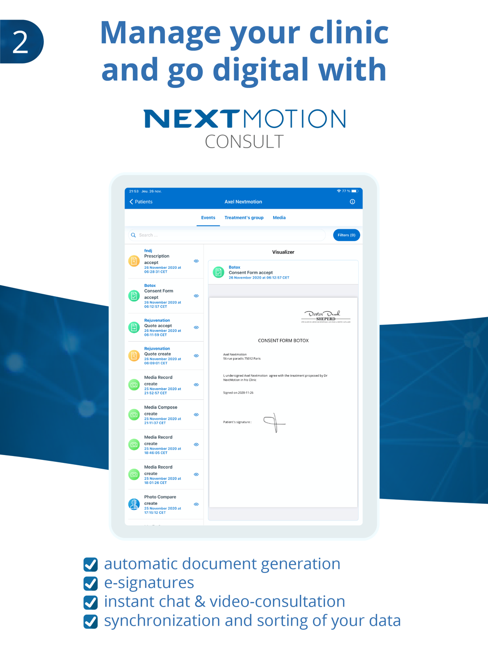 • Keep you patients’ data in our medical cloud for the highest security with NextMotion Cloud.