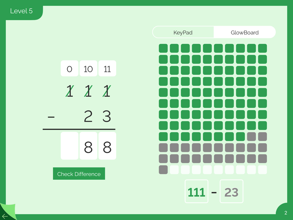 - Find: The app challenges students to solve missing number problems with the GlowBoard.