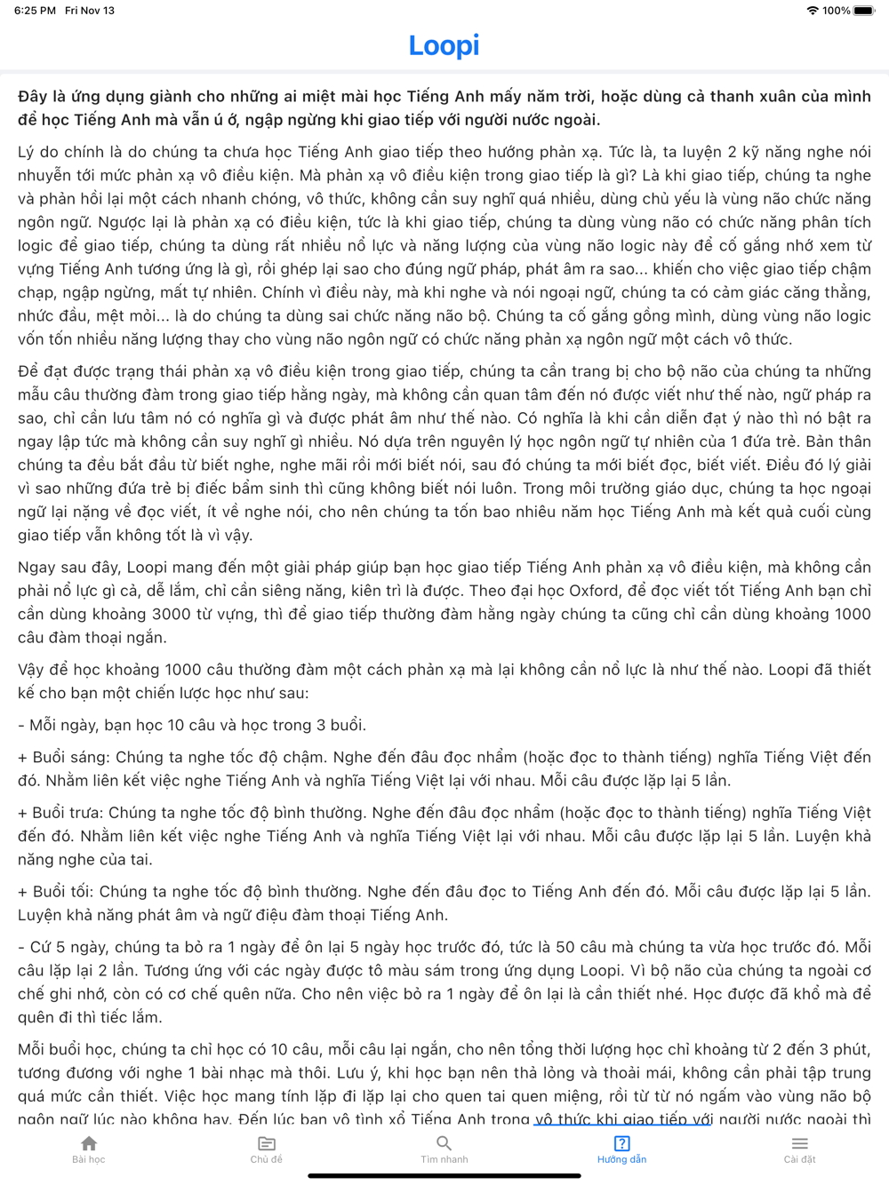 Loopi mang đến một giải pháp giúp bạn học giao tiếp Tiếng Anh phản xạ vô điều kiện, mà không cần phải nổ lực gì cả, dễ lắm, chỉ cần siêng năng, kiên trì là được. Theo đại học Oxford, để đọc viết tốt Tiếng Anh bạn chỉ cần dùng khoảng 3000 từ vựng, thì để giao tiếp thường đàm hằng ngày chúng ta cũng chỉ cần dùng khoảng 1000 câu đàm thoại ngắn.
